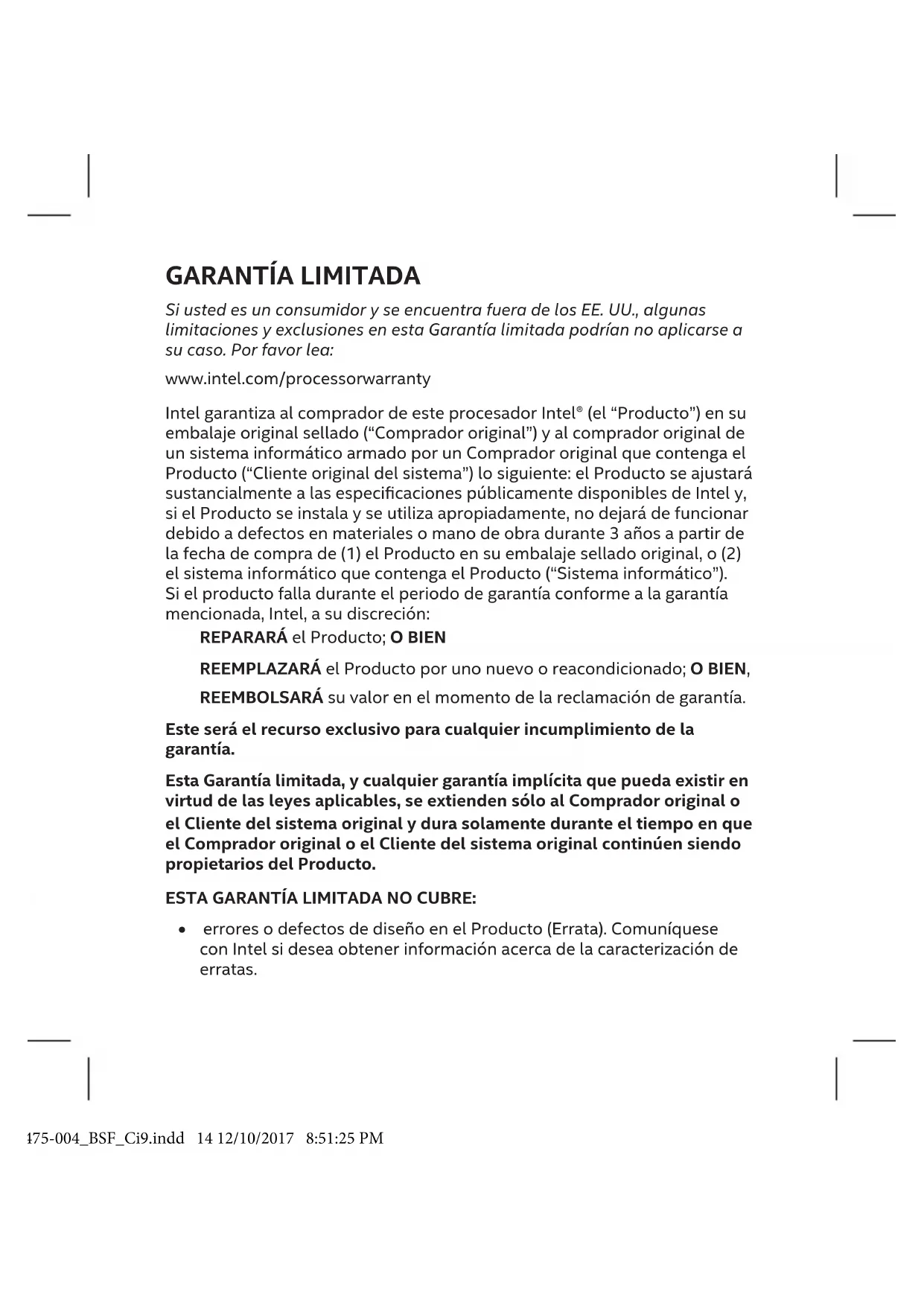 - erroresodefectosdediseñoenelProducto(Errata).Comuníquese conIntelsideseaobtenerinformaciónacercadelacaracterizaciónde erratas. J61475-004_BSF_Ci9.indd 14 12/10/2017 8:51:25 PM• loscostosasociadosconlareparaciónoelreemplazodelProducto,lo queincluyecostosderemociónoreemplazodelProducto;