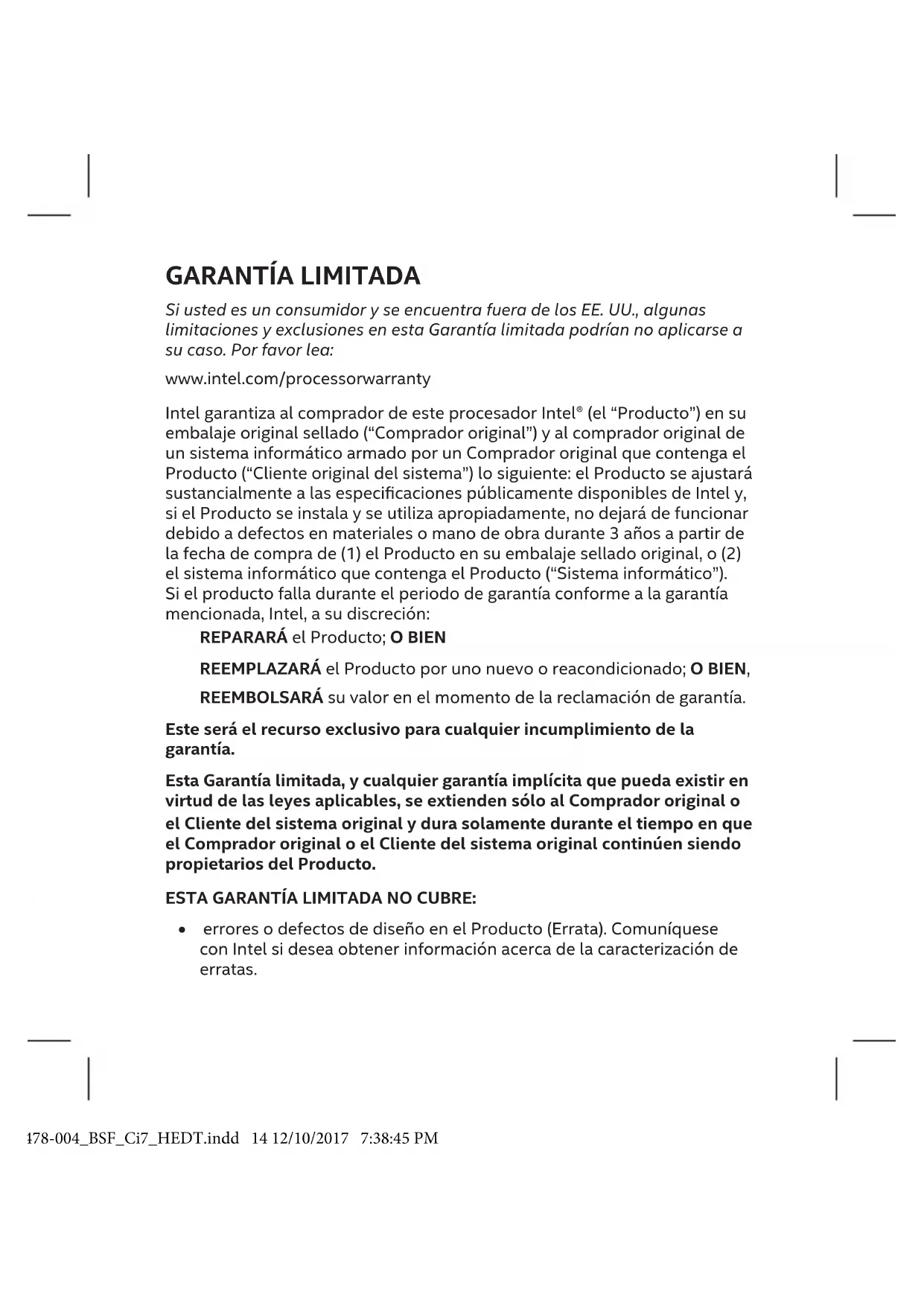 - erroresodefectosdediseñoenelProducto(Errata).Comuníquese conIntelsideseaobtenerinformaciónacercadelacaracterizaciónde erratas. J61478-004_BSF_Ci7_HEDT.indd 14 12/10/2017 7:38:45 PM• loscostosasociadosconlareparaciónoelreemplazodelProducto,lo queincluyecostosderemociónoreemplazodelProducto;