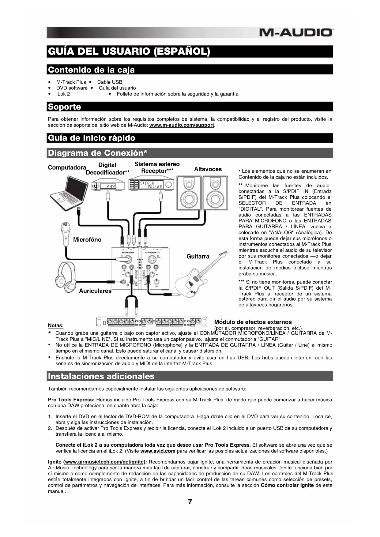 Notas: y Cuando grabe una guitarra o bajo con captor activo, ajuste el CONMUTADOR MICROFÓNO/LÍNEA / GUITARRA de M- Track Plus a "MIC/LINE". Si su instrumento usa un captor pasivo, ajuste el conmutador a "GUITAR". y No utilice la ENTRADA DE MICROFONO (Microphone) y la ENTRADA DE GUITARRA / LÍNEA (Guitar / Line) al mismo tiempo en el mismo canal. Esto puede saturar el canal y causar distorsión. y Enchufe la M-Track Plus directamente a su computador y evite usar un hub USB. Los hubs pueden interferir con las señales de sincronización de audio y MIDI de la interfaz M-Track Plus. Instalaciones adicionales También recomendamos especialmente instalar las siguientes aplicaciones de software: Pro Tools Express: Hemos incluido Pro Tools Express con su M-Track Plus, de modo que puede comenzar a hacer música con una DAW profesional en cuanto abra la caja: