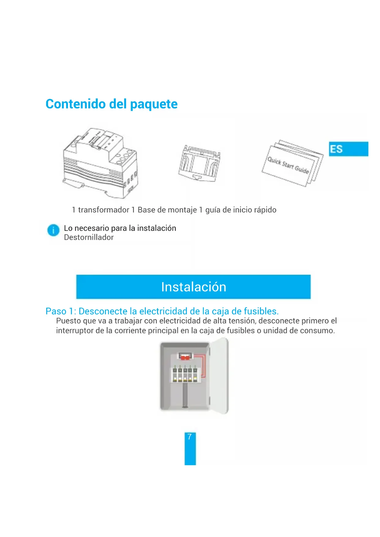 zu führen. Die resultierende Installation sollte ähnlich wie in der folgenden Abbildung aussehen. Eingang: 230 V AC 12 V AC zur Türklingel Ausgang: 12 V AC Schritt 4: Strom am Trennschalter wieder einschalten Weitere Informationen erhalten Sie auf www.ezviz.eu.7 Contenido del paquete 1 transformador 1 Base de montaje 1 guía de inicio rápido Lo necesario para la instalación Destornillador Instalación Paso 1: Desconecte la electricidad de la caja de fusibles. Puesto que va a trabajar con electricidad de alta tensión, desconecte primero el interruptor de la corriente principal en la caja de fusibles o unidad de consumo.8 Paso 2: Localice el transformador del videoportero existente. Para que el pulsador EZVIZ funcione debidamente, la alimentación debe ser de 12 VCA. Compruebe que el transformador de su pulsador actual satisfaga este requisito. De lo contrario, reemplácelo por el que se suministra en el paquete. Si necesita ayuda durante el proceso o vive en una zona en la que sea ilegal manipular su caja de fusibles o unidad de consumo, contrate a un electricista cualicado. Es probable que el transformador se encuentre en la caja de fusibles o unidad de consumo. Si no, mire en otros sitios donde haya componentes eléctricos instalados. Paso 3: Cablee el transformador.