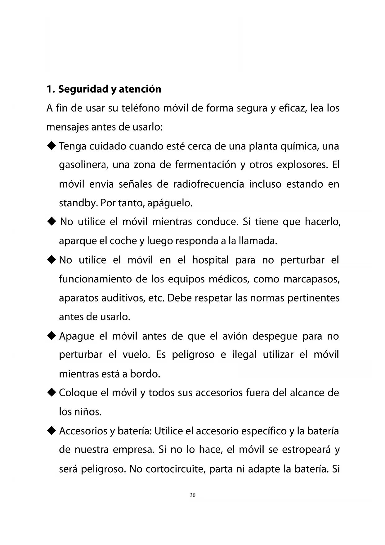 A fin de usar su teléfono móvil de forma segura y eficaz, lea los mensajes antes de usarlo: Tenga cuidado cuando esté cerca de una planta química, una gasolinera, una zona de fermentación y otros explosores. El móvil envía señales de radiofrecuencia incluso estando en standby. Por tanto, apáguelo. No utilice el móvil mientras conduce. Si tiene que hacerlo, aparque el coche y luego responda a la llamada. No utilice el móvil en el hospital para no perturbar el funcionamiento de los equipos médicos, como marcapasos, aparatos auditivos, etc. Debe respetar las normas pertinentes antes de usarlo. Apague el móvil antes de que el avión despegue para no perturbar el vuelo. Es peligroso e ilegal utilizar el móvil mientras está a bordo. Coloque el móvil y todos sus accesorios fuera del alcance de los niños. Accesorios y batería: Utilice el accesorio específico y la batería de nuestra empresa. Si no lo hace, el móvil se estropeará y será peligroso. No cortocircuite, parta ni adapte la batería. Si31 detecta que el móvil tiene una temperatura demasiado alta, está descolorido, distinto, hinchado, gotea o cualquier otro fenómeno, deje de usarlo y cambie la batería inmediatamente para que no afecte a la seguridad. Deje la batería vieja en los puntos de reciclajes para tal efecto. Sin batería no hay carga. Cuando quite la batería apague el móvil para no destruir las propiedades del mismo. El teléfono no es resistente al agua. Intente mantenerla seca. Evite usar el móvil en una temperatura demasiado alta o demasiado baja. No lance, deje caer ni golpee el móvil para no destruir el interior o el exterior del mismo. Servicio autorizado: Deje que sea un profesional quien instale y haga el mantenimiento del móvil. No desmonte el móvil. La unidad de conteo de la radiación estándar se llama SAR. Según la norma internacional, el límite de SAR es de 2 W/kg. La SAR de este teléfono es de 0,482 W/kg. Cumple con el criterio de estado GB 21288-2007.