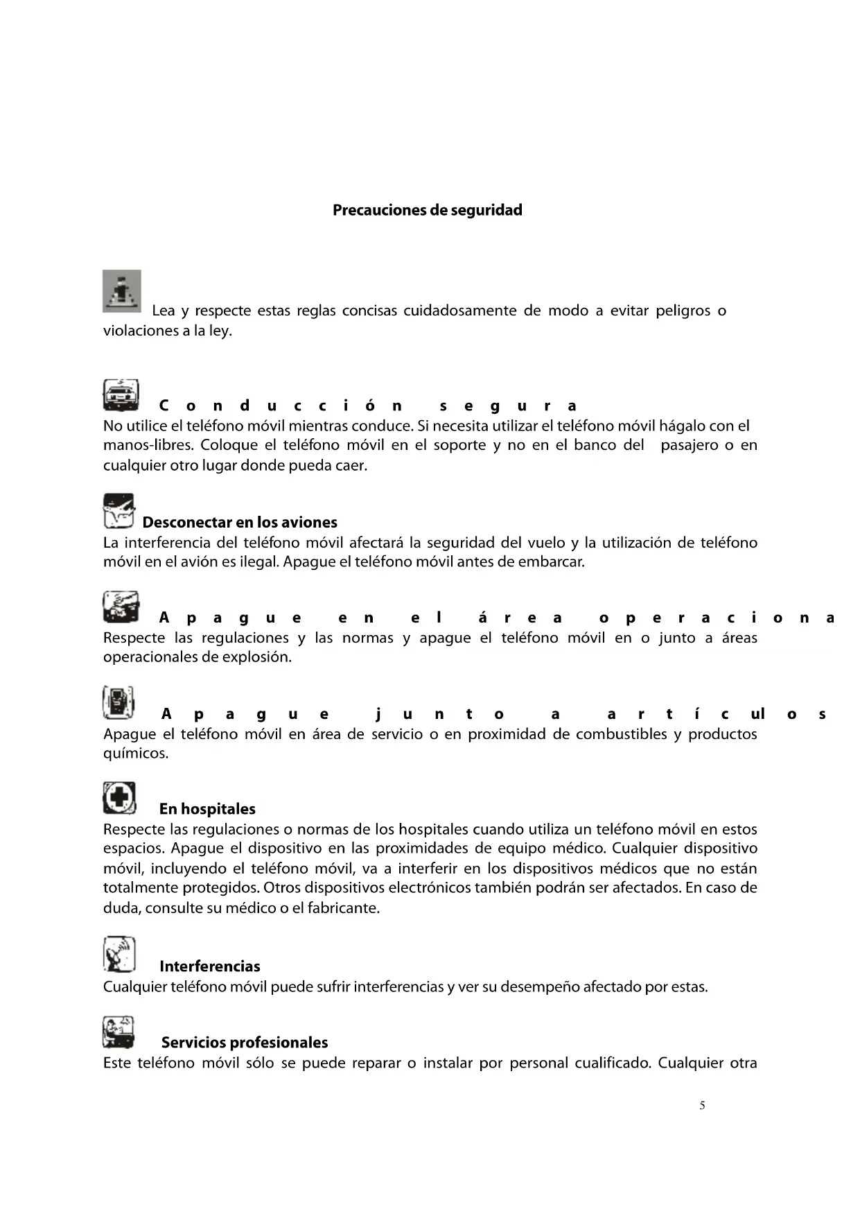 Conducción segura No utilice el teléfono móvil mientras conduce. Si necesita utilizar el teléfono móvil hágalo con el manos-libres. Coloque el teléfono móvil en el soporte y no en el banco del pasajero o en cualquier otro lugar donde pueda caer. Desconectar en los aviones La interferencia del teléfono móvil afectará la seguridad del vuelo y la utilización de teléfono móvil en el avión es ilegal. Apague el teléfono móvil antes de embarcar. Apague en el área operacional de explosión Respecte las regulaciones y las normas y apague el teléfono móvil en o junto a áreas operacionales de explosión. Apague junto a artículos peligrosos Apague el teléfono móvil en área de servicio o en proximidad de combustibles y productos químicos. En hospitales Respecte las regulaciones o normas de los hospitales cuando utiliza un teléfono móvil en estos espacios. Apague el dispositivo en las proximidades de equipo médico. Cualquier dispositivo móvil, incluyendo el teléfono móvil, va a interferir en los dispositivos médicos que no están totalmente protegidos. Otros dispositivos electrónicos también podrán ser afectados. En caso de duda, consulte su médico o el fabricante. Interferencias Cualquier teléfono móvil puede sufrir interferencias y ver su desempeño afectado por estas. Servicios profesionales Este teléfono móvil sólo se puede reparar o instalar por personal cualificado. Cualquier otra6 intervención puede causar graves peligros, además de violar las cláusulas de la garantía.
