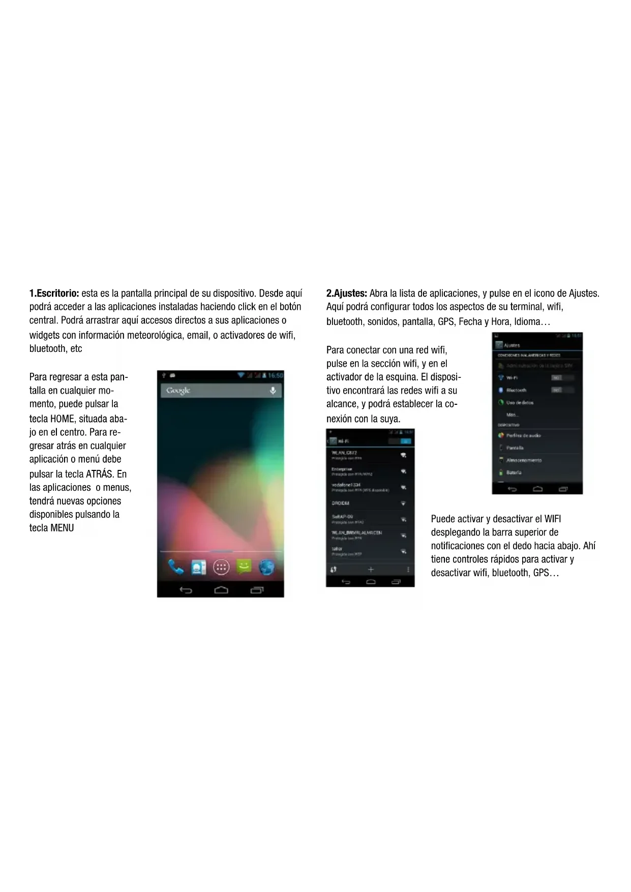 2.Ajustes: Abra la lista de aplicaciones, y pulse en el icono de Ajustes. Aquí podrá configurar todos los aspectos de su terminal, wifi, bluetooth, sonidos, pantalla, GPS, Fecha y Hora, Idioma… Para conectar con una red wifi, pulse en la sección wifi, y en el activador de la esquina. El disposi- tivo encontrará las redes wifi a su alcance, y podrá establecer la co- nexión con la suya.