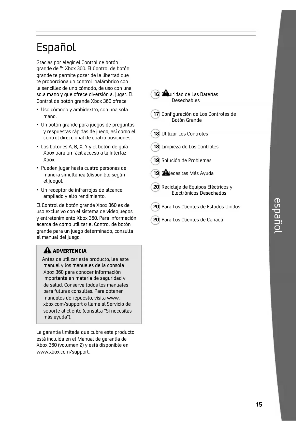 - Un receptor de infrarrojos de alcance ampliado y alto rendimiento. El Control de botón grande Xbox 360 es de uso exclusivo con el sistema de videojuegos y entretenimiento Xbox 360. Para información acerca de cómo utilizar el Control de botón grande para un juego determinado, consulta el manual del juego. La garantía limitada que cubre este producto está incluida en el Manual de garantía de Xbox 360 (volumen 2) y está disponible en www.xbox.com/support. aDVErTEncia Antes de utilizar este producto, lee este manual y los manuales de la consola Xbox 360 para conocer información importante en materia de seguridad y de salud. Conserva todos los manuales para futuras consultas. Para obtener manuales de repuesto, visita www. xbox.com/support o llama al Servicio de soporte al cliente (consulta “Si necesitas más ayuda”). aDVErTEncia Antes de utilizar este producto, lee este manual y los manuales de la consola Xbox 360 para conocer información importante en materia de seguridad y de salud. Conserva todos los manuales para futuras consultas. Para obtener manuales de repuesto, visita www. xbox.com/support o llama al Servicio de soporte al cliente (consulta “Si necesitas más ayuda”). 16 Seguridad de Las Baterías Desechables 17 Conguración de Los Controles de Botón Grande 18 Utilizar Los Controles 18 Limpieza de Los Controles 19 Solución de Problemas 19 Si Necesitas Más Ayuda 20 Reciclaje de Equipos Eléctricos y Electrónicos Desechados 20 Para Los Clientes de Estados Unidos 20 Para Los Clientes de Canadáespañol