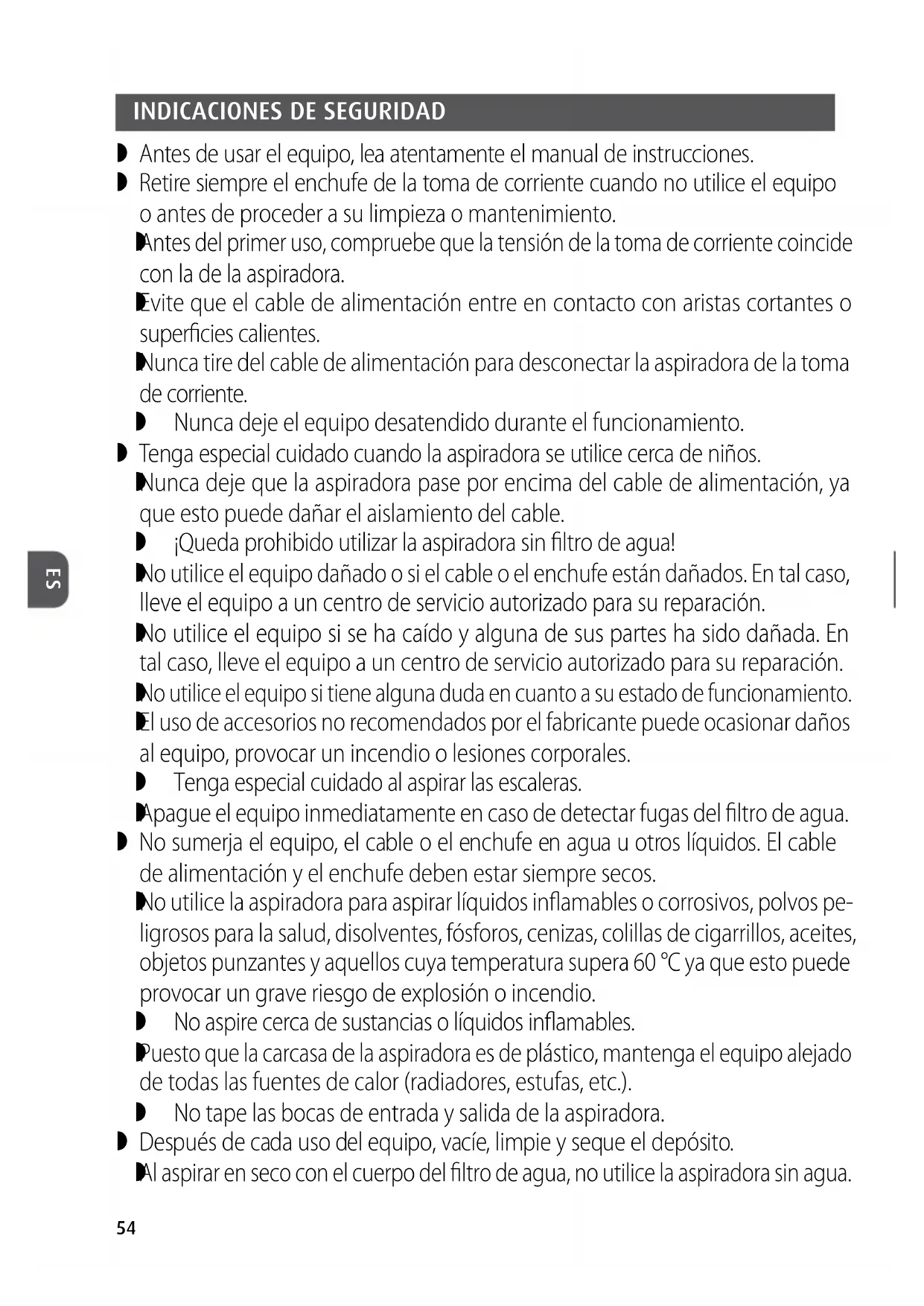 No utilice la aspiradora para aspirar líquidos inflamables o corrosivos, polvos pe- ligrosos para la salud, disolventes, fósforos, cenizas, colillas de cigarrillos, aceites, objetos punzantes y aquellos cuya temperatura supera 60°C ya que esto puede provocar un grave riesgo de explosión o incendio. No aspire cerca de sustancias o líquidos inflamables.