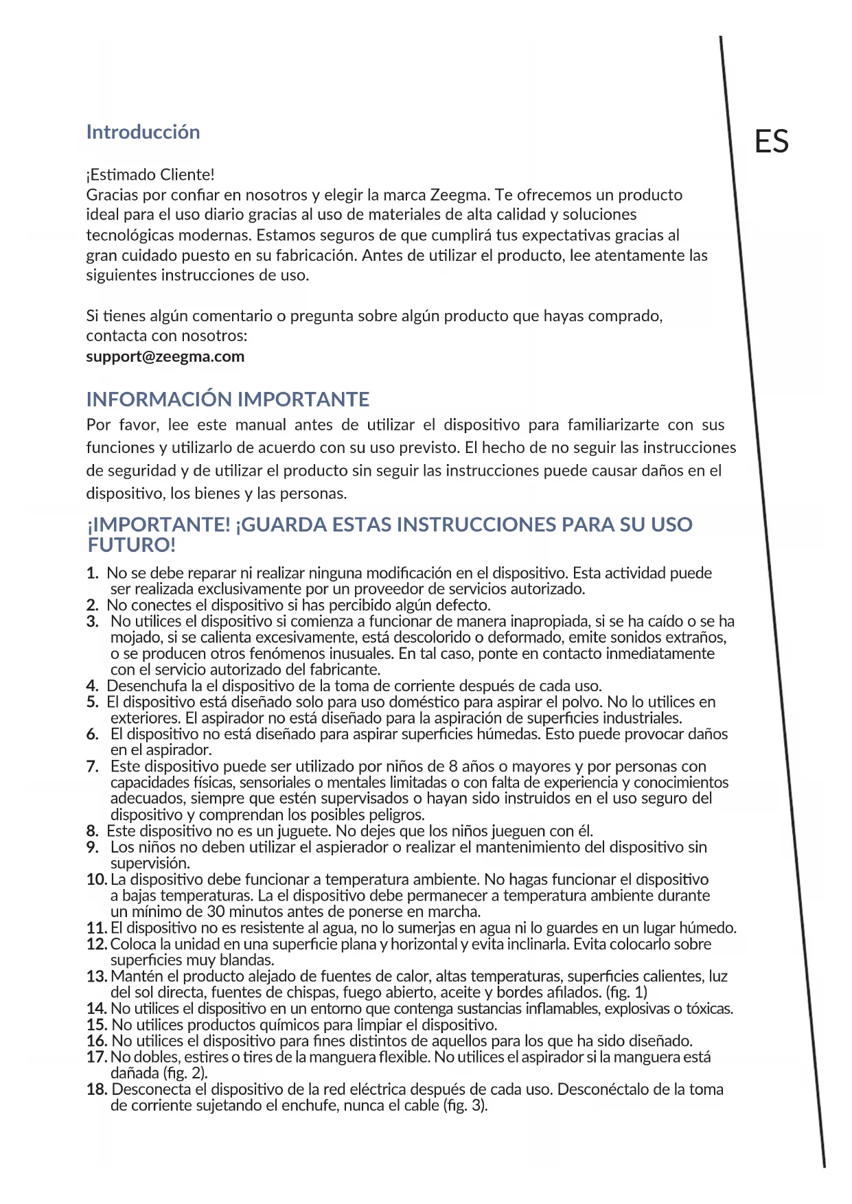 les tapis dans la poignée sur l’aspirateur. Les photos sont à caractère informaf, l’apparence réelle des produits peut varier de celle présentée sur les photos. Bouton d’enroulement 1ES Introducción ¡Esmado Cliente! Gracias por conar en nosotros y elegir la marca Zeegma. Te ofrecemos un producto ideal para el uso diario gracias al uso de materiales de alta calidad y soluciones tecnológicas modernas. Estamos seguros de que cumplirá tus expectavas gracias al gran cuidado puesto en su fabricación. Antes de ulizar el producto, lee atentamente las siguientes instrucciones de uso. Si enes algún comentario o pregunta sobre algún producto que hayas comprado, contacta con nosotros: support@zeegma.com