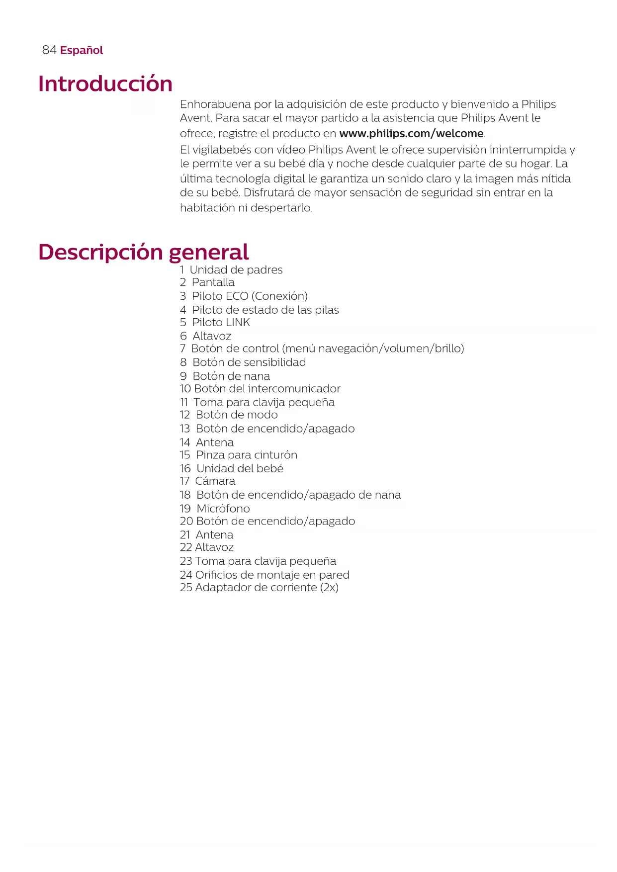 Warum ertönt ein Summgeräusch aus der Elterneinheit? Wenn sich die Elterneinheit und die Babyeinheit zu weit voneinander entfernt benden, können Störungen auftreten. Dies kann auch geschehen, wenn zwischen der Elterneinheit und der Babyeinheit zu viele Wände oder Decken liegen oder wenn andere drahtlose Geräte, die im Bereich 2,4 GHz senden, eingeschaltet sind (z. B. Mikrowelle, Wi-Fi-Router). Stellen Sie die Elterneinheit an einem anderen Ort näher an der Babyeinheit auf, oder schalten Sie andere drahtlose Geräte aus. Falls diese Antwort nicht hilfreich ist, schauen Sie in den Häug gestellten Fragen nach "Warum ertönt aus der Elterneinheit und/oder Babyeinheit ein Pfeifton?" Wie lange wird das Schlaieds von der Babyeinheit gespielt? Nachdem Sie ein Schlaied ausgewählt haben, und es wird für ca. 15 Minuten fortlaufend wiederholt. Falls Sie alle Lieder spielen möchten, wählen Sie die letzte Option in der Schlaied-Liste aus. Wie kann ich die Lautstärke des Schlaieds erhöhen? Sie können die Lautsprecherlautstärke des Schlaieds an der Elterneinheit einstellen, jedoch nicht an der Babyeinheit. Drücken Sie die Schlaied-Taste an der Elterneinheit, um das Schlaied-Menü zu önen und die Lautstärke einzustellen. BETRIEBSZEIT/EMPFANGSBEREICH Frage Antwort Warum ist die Reichweite meines Babyphones viel geringer als im Benutzerhandbuch angegeben? Der angegebene Betriebsbereich von 300 Metern gilt nur im oenen Außenbereich und bei unbehinderter Sichtlinie. Je nach Umgebung und anderen Störfaktoren kann die Reichweite geringer sein (siehe auch die Tabelle im Kapitel über das Aufstellen der Eltern- und Babyeinheiten). Innerhalb des Hauses beträgt der Betriebsbereich maximal 50 Meter und ist außerdem durch die Anzahl und Beschaenheit der Wände bzw. Decken zwischen der Elterneinheit und der Babyeinheit begrenzt. Die Betriebszeit der Elterneinheit sollte bis zu 10 Stunden betragen. Warum ist die Betriebszeit meiner Elterneinheit kürzer? Möglicherweise ist die Videohelligkeit der Elterneinheit zu hoch eingestellt, und die Elterneinheit verbraucht viel Energie. Verringern Sie die Helligkeit der Elterneinheit. Die Elterneinheit verbraucht viel Energie, wenn das Video-Display dauerhaft eingeschaltet sind. Aktivieren Sie einen der Modi AUDIO, VOX oder ECO im Menü der Elterneinheit, um die Betriebszeit zu erhöhen (siehe Abschnitte "AUDIO-Modus“,"VOX-Modus“ und "ECO-Modus“ im Kapitel "Produktmerkmale“). Möglicherweise ist die Lautstärke der Elterneinheit zu hoch eingestellt, und die Elterneinheit verbraucht viel Energie. Verringern Sie die Lautstärke an der Elterneinheit. Wie bei jedem anderen wiederauadbaren Elektronikgerät verringert sich die Akkukapazität nach langer Nutzung.82 Deutsch VIDEO-ANZEIGE Frage Antwort Weshalb ist die Elterneinheit gestört? Warum ackert das Video-Display an der Elterneinheit? Wenn sich die Elterneinheit und die Babyeinheit zu weit voneinander entfernt benden, können Störungen auftreten. Dies kann auch geschehen, wenn zwischen der Elterneinheit und der Babyeinheit zu viele Wände oder Decken liegen oder wenn andere drahtlose Geräte, die im Bereich 2,4 GHz senden, eingeschaltet sind (z. B. Mikrowelle, Wi-Fi-Router). Unter Umständen haben Sie mehr als 2 Sets Babyphone, sodass Störungen auftreten können. Halten Sie diese 2 Baby-Einheiten voneinander fern, idealerweise in separaten Räumen. Stellen Sie die Elterneinheit an einem anderen Ort näher an der Babyeinheit auf, oder schalten Sie andere drahtlose Geräte aus. Der Akku der Elterneinheit muss möglicherweise aufgeladen werden. Warum wird kein Bild auf dem Video-Display angezeigt, wenn die Verbindungsanzeige grün leuchtet? Die Elterneinheit bendet sich möglicherweise in einem der Modi AUDIO, VOX oder ECO. Drücken Sie die Modus-Taste an der rechten Seite der Elterneinheit, um des Modus (siehe 'Betriebsarten') zu wechseln. Warum ist das Bild auf dem Video-Display nicht gut zu erkennen? Möglicherweise ist die Anzeigehelligkeit zu gering eingestellt. Erhöhen Sie die Anzeigehelligkeit an der Elterneinheit mithilfe der Bedienungstaste in der Mitte. Möglicherweise ist die Linse der Babyeinheit verschmutzt. Reinigen Sie die Linse mit einem trockenen Tuch. Möglicherweise bendet sich die Babyeinheit zu weit vom Baby entfernt. Stellen Sie sicher, dass die Babyeinheit maximal 1,5 Meter weit vom Baby entfernt ist, um eine optimale Videoquality zu erreichen. Bei einer geringeren Entfernung als 1 m besteht die Gefahr des Strangulierens.83Deutsch Wandanbringung Druckanleitungen: Drucken Sie diese Seite im Maßstab von 100 % und verwenden Sie die Schablone, um den genauen Ort der Bohrlöcher an der Wand zu markieren. Allgemeine Informationen Wiederauadbarer Lithium-Ionen-Akku (2.600 mAh) FHSS-Frequenzband 2,4 GHz. Maximale Funkfrequenzleistung: <=20 dBm Netzgerät: Modell: ASSA105E-050100 (EU-Stecker) oder ASSA105B-050100 (UK-Stecker) Eingangsleistung: 100 bis 240 V~; 50/60 Hz; 0,35 A Ausgang: 5,0 V 1,0 A, 5,0 W. Durchschnittlicher aktiver Wirkungsgrad: >=73,62% Stromverbrauch im Leerlauf (W): 0,1 W84 Español Introducción Enhorabuena por la adquisición de este producto y bienvenido a Philips Avent. Para sacar el mayor partido a la asistencia que Philips Avent le ofrece, registre el producto en www.philips.com/welcome. El vigilabebés con vídeo Philips Avent le ofrece supervisión ininterrumpida y le permite ver a su bebé día y noche desde cualquier parte de su hogar. La última tecnología digital le garantiza un sonido claro y la imagen más nítida de su bebé. Disfrutará de mayor sensación de seguridad sin entrar en la habitación ni despertarlo. Descripción general 1 Unidad de padres 2 Pantalla 3 Piloto ECO (Conexión) 4 Piloto de estado de las pilas 5 Piloto LINK 6 Altavoz 7 Botón de control (menú navegación/volumen/brillo) 8 Botón de sensibilidad 9 Botón de nana 10 Botón del intercomunicador 11 Toma para clavija pequeña 12 Botón de modo 13 Botón de encendido/apagado 