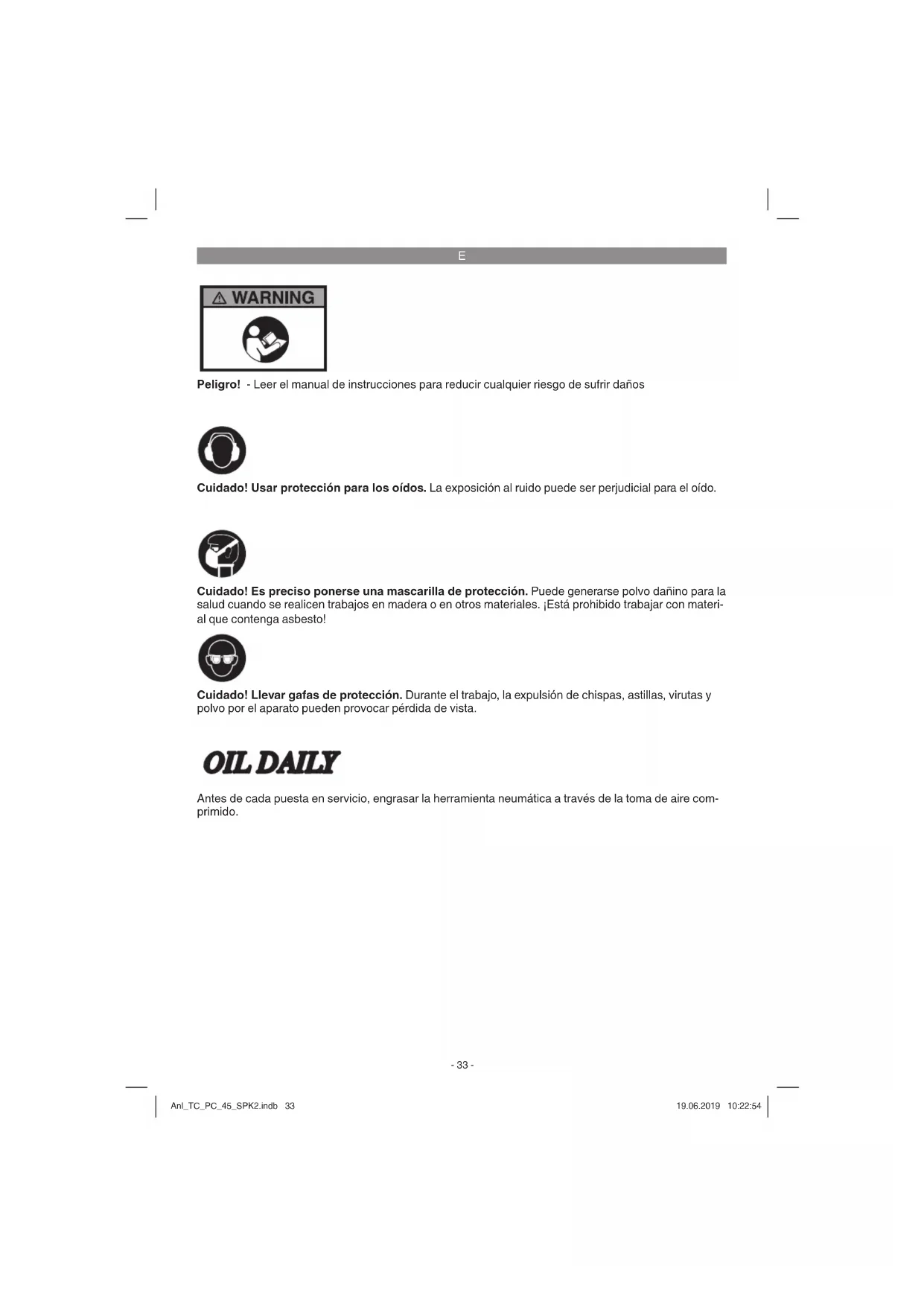 Peligro! - Leer el manual de instrucciones para reducir cualquier riesgo de sufrir daños Cuidado! Usar protección para los oídos. La exposición al ruido puede ser perjudicial para el oído. Cuidado! Llevar gafas de protección. Durante el trabajo, la expulsión de chispas, astillas, virutas y polvo por el aparato pueden provocar pérdida de vista. Cuidado! Es preciso ponerse una mascarilla de protección. Puede generarse polvo dañino para la salud cuando se realicen trabajos en madera o en otros materiales. ¡Está prohibido trabajar con materi- al que contenga asbesto! Antes de cada puesta en servicio, engrasar la herramienta neumática a través de la toma de aire com- primido. Anl_TC_PC_45_SPK2.indb 33Anl_TC_PC_45_SPK2.indb 33 19.06.2019 10:22:5419.06.2019 10:22:54E