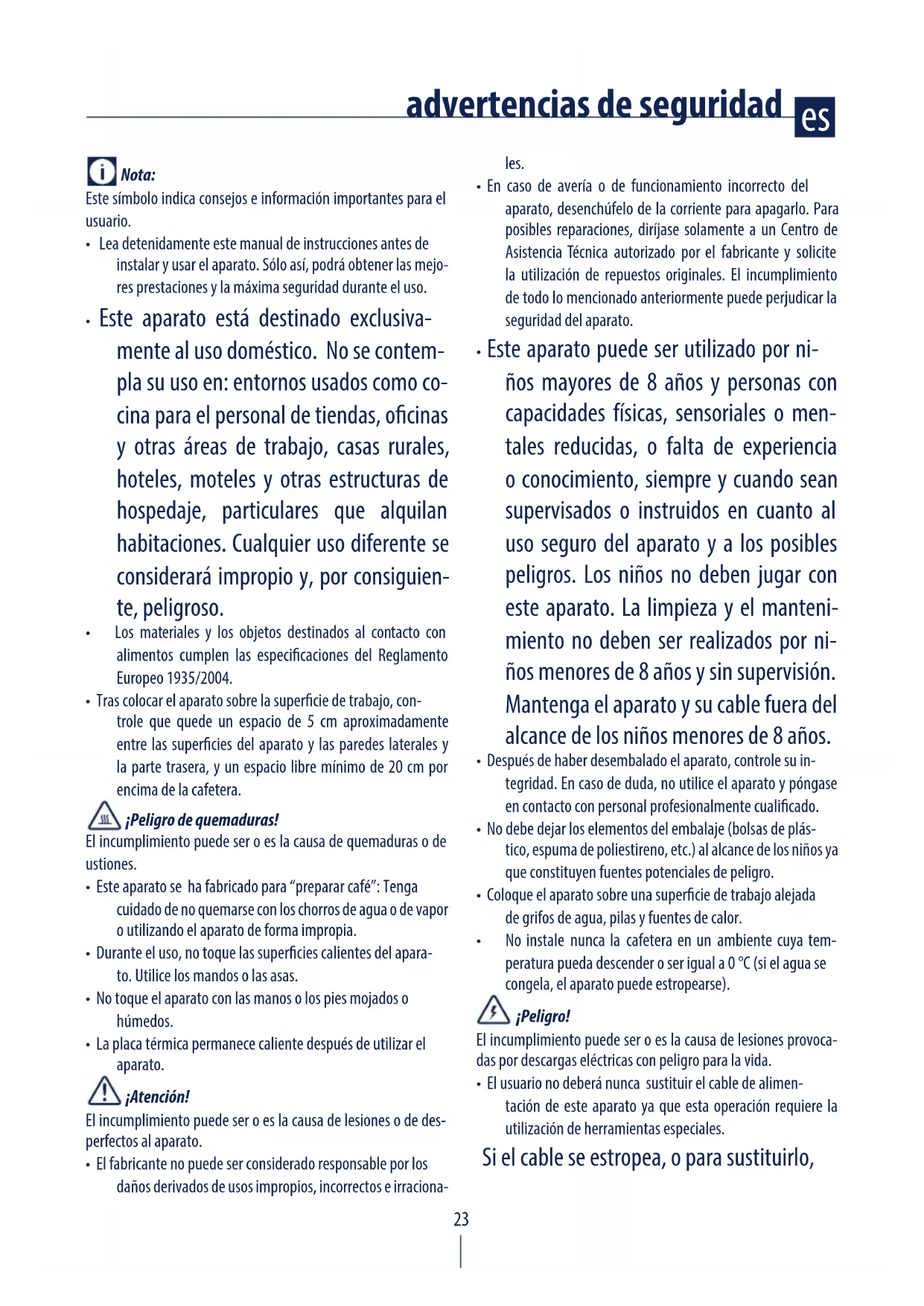 - Este aparato se ha fabricado para “preparar café”: Tenga cuidado de no quemarse con los chorros de agua o de vapor o utilizando el aparato de forma impropia.