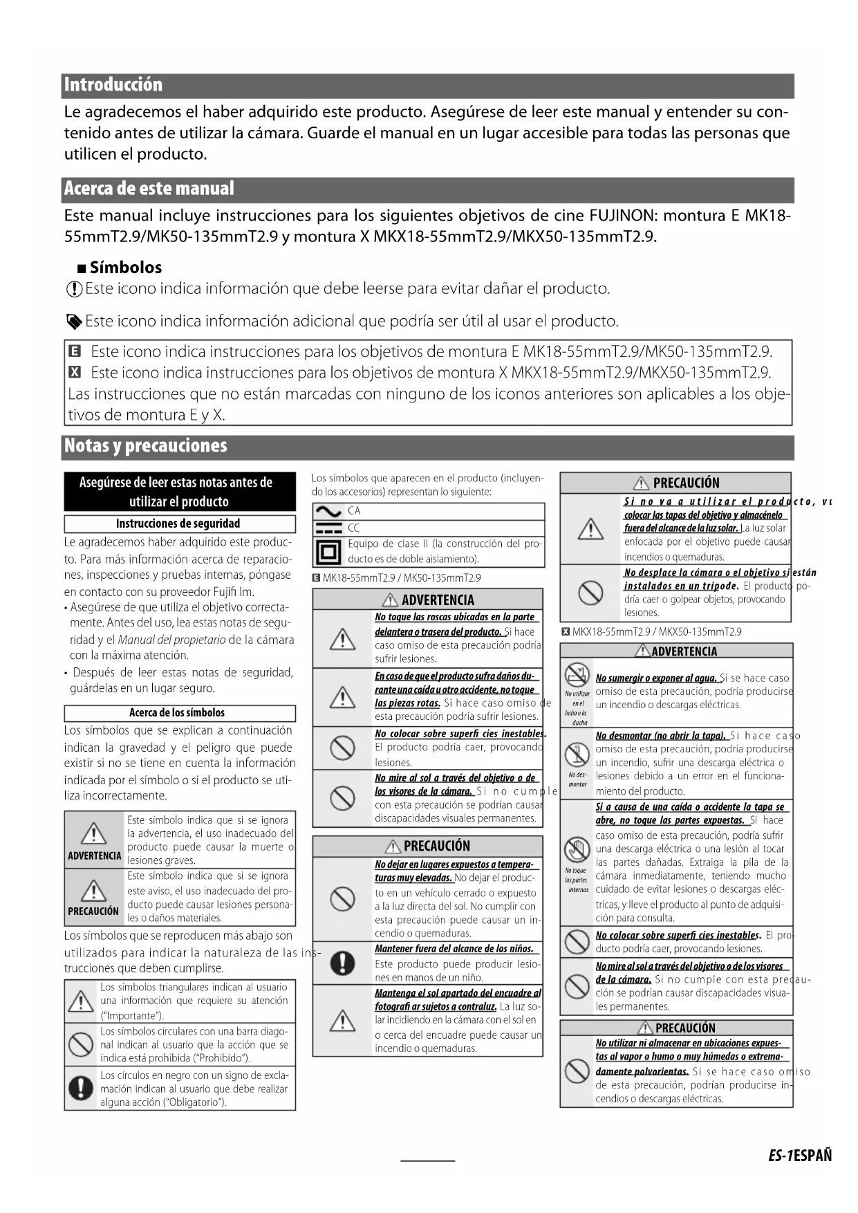 PRECAUCIÓN PRECAUCIÓN Si no va a utilizar el producto, vuelva a colocar las tapas del objetivo y almacénelo fuera del alcance de la luz solar. La luz solar enfocada por el objetivo puede causar incendios o quemaduras.No desplace la cámara o el objetivo si están instalados en un trípode. El producto po-dría caer o golpear objetos, provocando lesiones.X MKX18-55mmT2.9 / MKX50-135mmT2.9 ADVERTENCIA ADVERTENCIA No utilizar en el baño o la duchaNo sumergir o exponer al agua. Si se hace caso omiso de esta precaución, podría producirse un incendio o descargas eléctricas.No des-montarNo desmontar (no abrir la tapa). Si hace caso omiso de esta precaución, podría producirse un incendio, sufrir una descarga eléctrica o lesiones debido a un error en el funciona-miento del producto.No toque las partes internasSi a causa de una caída o accidente la tapa se abre, no toque las partes expuestas. Si hace caso omiso de esta precaución, podría sufrir una descarga eléctrica o una lesión al tocar las partes dañadas. Extraiga la pila de la cámara inmediatamente, teniendo mucho cuidado de evitar lesiones o descargas eléc-tricas, y lleve el producto al punto de adquisi-ción para consulta.No colocar sobre super cies inestables. El pro-ducto podría caer, provocando lesiones.No mire al sol a través del objetivo o de los visores de la cámara. Si no cumple con esta precau-ción se podrían causar discapacidades visua-les permanentes. PRECAUCIÓN PRECAUCIÓN No utilizar ni almacenar en ubicaciones expues-tas al vapor o humo o muy húmedas o extrema-damente polvorientas. Si se hace caso omiso de esta precaución, podrían producirse in-cendios o descargas eléctricas. Introducción Le agradecemos el haber adquirido este producto. Asegúrese de leer este manual y entender su con- tenido antes de utilizar la cámara. Guarde el manual en un lugar accesible para todas las personas que utilicen el producto. Acerca de este manual Este manual incluye instrucciones para los siguientes objetivos de cine FUJINON: montura E MK18- 55mmT2.9/MK50-135mmT2.9 y montura X MKX18-55mmT2.9/MKX50-135mmT2.9. ■ Símbolos
