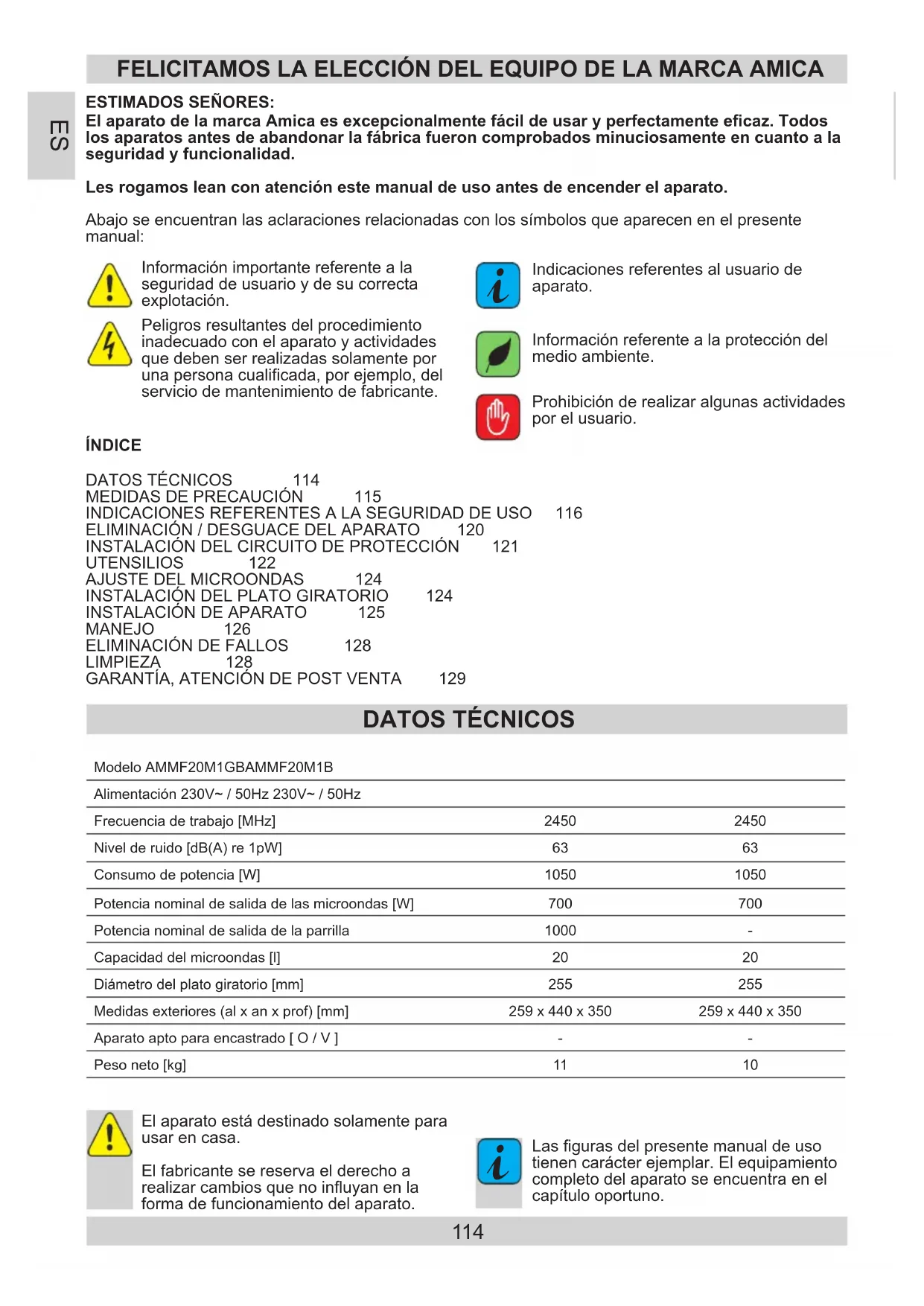 ÍNDICEDATOS TÉCNICOS 114MEDIDAS DE PRECAUCIÓN 115INDICACIONES REFERENTES A LA SEGURIDAD DE USO 116ELIMINACIÓN / DESGUACE DEL APARATO 120INSTALACIÓN DEL CIRCUITO DE PROTECCIÓN 121UTENSILIOS 122AJUSTE DEL MICROONDAS 124INSTALACIÓN DEL PLATO GIRATORIO 124INSTALACIÓN DE APARATO 125MANEJO 126ELIMINACIÓN DE FALLOS 128LIMPIEZA 128GARANTÍA, ATENCIÓN DE POST VENTA 129 Modelo AMMF20M1GB AMMF20M1BAlimentación 230V~ / 50Hz 230V~ / 50HzFrecuencia de trabajo [MHz] 2450 2450Nivel de ruido [dB(A) re 1pW] 63 63Consumo de potencia [W] 1050 1050 Potencia nominal de salida de las microondas [W] 700 700 Potencia nominal de salida de la parrilla 1000 - Capacidad del microondas [l] 20 20Diámetro del plato giratorio [mm] 255 255 Medidas exteriores (al x an x prof) [mm] 259 x 440 x 350 259 x 440 x 350 Aparato apto para encastrado [ O / V ] - - Peso neto [kg] 11 10115