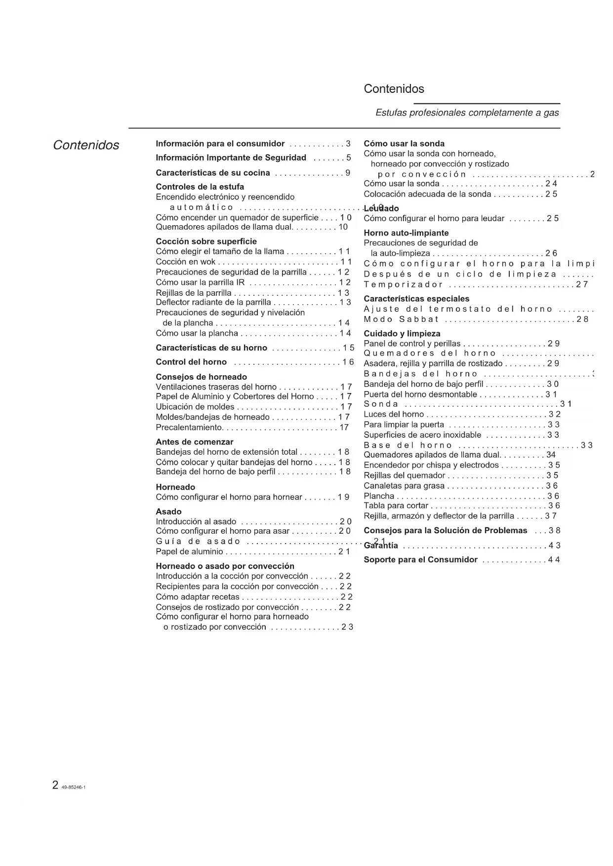 del quemador. Verifique que la tapa del quemador esté bien colocada sobre el cabezal del quemador. Quemadores apilados de llama dual Cabezal del quemadorBase del quemadorElectrodoTapa del quemadorTapa del quemador mal colocadaTapa del quemador bien colocada Cuidado y limpieza Estufas profesionales completamente a gas49-85246-1 35 El electrodo del sistema de encendido electrónico se encuentra ubicado en la parte trasera de la base del quemador. Cuando limpie la estufa, tenga cuidado de no enganchar el encendedor con el paño de limpieza. El encendedor podría dañarse. Tenga cuidado de no empujar la perilla de control hacia adentro mientras realiza la limpieza. Podría provocar el accionamiento del encendedor por chispa. Asegúrese de que los encendedores de cerámica blancos ubicados sobre la estufa estén secos y limpios. Limpie la porción de metal del electrodo con un paño suave o una lija. No trate que quitar el electrodo de la estufa. Encendedor por chispa y electrodos Limpie esta parte de metal con una lija. No limpie esta parte de cerámica blanca con una lija. Rejillas del quemador Las rejillas del quemador de hierro fundido esmaltado deben limpiarse regularmente. Las rejillas pueden limpiarse dentro del horno durante el ciclo de auto-limpieza, o en el lavaplatos. Los armazones deben limpiarse a mano o en el lavaplatos. Lávelos en agua caliente jabonosa, enjuague y seque bien. A pesar de ser resistentes, las rejillas gradualmente irán perdiendo el brillo, aunque les brinde el mayor cuidado. Esto se debe a su exposición continua a altas temperaturas. No haga funcionar el quemador durante un período prolongado sin recipientes de cocción sobre la rejilla. El acabado de la rejilla puede saltarse sin un recipiente que absorba el calor. Para estabilidad, los armazones cuentan con almohadillas de goma en cada esquina. Durante la limpieza y el uso, tenga cuidado de no dañar o enganchar las almohadillas de goma. Rejillas Armazón Almohadillas Cuidado y limpieza Estufas profesionales completamente a gas36 49-85246-1 La grasa proveniente de la plancha y de la parrilla drenará dentro de las canaletas para grasa de hierro fundido esmaltado en la parte frontal de la cocina. Una vez que las canaletas se hayan enfriado, pueden quitarse para efectuar una limpieza más cómoda. Para quitar la canaleta para grasa fría de la plancha, deslícela hacia el frente y levántela. Para quitar la canaleta para grasa fría de la plancha, levante el armazón de la parrilla y levante la canaleta. No permita la acumulación de grasa en las canaletas porque pueden generar un peligro de incendio. Limpie las canaletas para grasa tan pronto como se enfríen. Las canaletas para grasa pueden limpiarse a mano con agua caliente jabonosa o en el lavaplatos. Limpie cualquier derrame del tazón de la canaleta con un paño suave. Para lograr estabilidad, las canaletas cuentan con almohadillas de goma en la parte frontal. Tenga cuidado de no dañar las almohadillas cuando las quite para la limpieza. Canaletas para grasa (en algunos modelos) Canaletas para grasa Plancha (en algunos modelos) Tabla para cortar (en algunos modelos) Quite bien la grasa y las partículas de comida de la plancha utilizando una espátula de metal de lados rectos, mientras todavía esté caliente. Limpie la plancha con un paño seco, resistente y grueso para eliminar los residuos restantes y partículas de alimentos. Si la plancha se limpia con otro elemento que no sea un paño seco, resistente y grueso, ésta tendrá que volver a curarse. Nunca llene la plancha caliente con agua fría. Esto podría quebrar o torcer la plancha. 127$ Es normal que la plancha en acero inoxidable se ponga de color amarillo-café después del uso. Limpie la tabla para cortar de bambú con agua tibia y jabón suave. De vez en cuando límpiela con aceite mineral. No lave la tabla para cortar en el lavaplatos. Cuidado y limpieza Estufas profesionales completamente a gas49-85246-1 37 La parrilla IR debe limpiarse inmediatamente después de cada uso. &yPROLPSLDUODUHMLOODGHODSDUULOOD Gire el quemador a OFF (apagado). Utilice una agarradera para quitar la rejilla de la parrilla caliente. Coloque la rejilla de la parrilla en un tazón o fregadero y friegue con un cepillo de cerdas de bronce. Enjuague con frecuencia. La rejilla de la parrilla también puede limpiarse en el horno durante el ciclo de auto-limpieza, o puede lavarse en el lavaplatos.