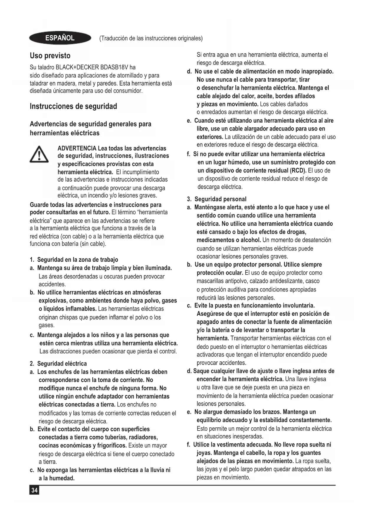 BDASB18 - Taladro de impacto Black & Decker declara que los productos descritos bajo “datos técnicos” son conformes a las normas: 2006/42/EC, EN62841-1:2015 EN62841-2-1:2018+A11:2019. Estos productos son conformes también a las Directrices 2014/30/EU y 2011/65/EU. Si desea más información, póngase en contacto con Black & Decker en la dirección indicada a continuación o bien consulte la parte posterior de este manual. El que suscribe es responsable de la compilación del archivo técnico y realiza esta declaración en representación de Black & Decker. Ed Higgins Director – Consumer Power Tools Black & Decker Europe, 270 Bath Road, Slough, Berkshire, SL1 4DX Reino Unido 29/11/2019 Garantía Black & Decker confía en la calidad de sus productos y ofrece a los consumidores una garantía de 24 meses a partir de la fecha de compra. Esta garantía es complementaria y en ningún caso afectará a sus derechos estatutarios. La garantía es válida dentro de los territorios de los Estados Miembros de la Unión Europea y del Área de Libre Comercio Europea. Para reclamar la garantía, la reclamación debe cumplir los términos y condiciones de Black&Decker y usted deberá remitir el comprobante de la compra al vendedor o al centro oficial de reparación. Puede consultar las condiciones de la garantía de 2 años de Black & Decker y la ubicación más cercana de su centro oficial de reparación en www.2helpU.com o contactando con su oficina local de Black & Decker en la dirección indicada en este manual. Visite nuestra página web www.blackanddecker.co.uk para registrar su nuevo producto de Black & Decker y recibir noticias de nuevos productos y ofertas especiales. (Traducción de las instrucciones originales) ESPAÑOL42 Προβλεπόμενη χρήση Το κρουστικό σας δράπανο BLACK+DECKER BDASB18V έχει σχεδιαστεί για εφαρμογές βιδώματος και για διάτρηση σε ξύλο, μέταλλο και υλικά τοιχοποιίας. Αυτό το εργαλείο προορίζεται μόνο για καταναλωτική χρήση. Οδηγίες ασφαλείας Γενικές προειδοποιήσεις ασφαλείας για ηλεκτρικά