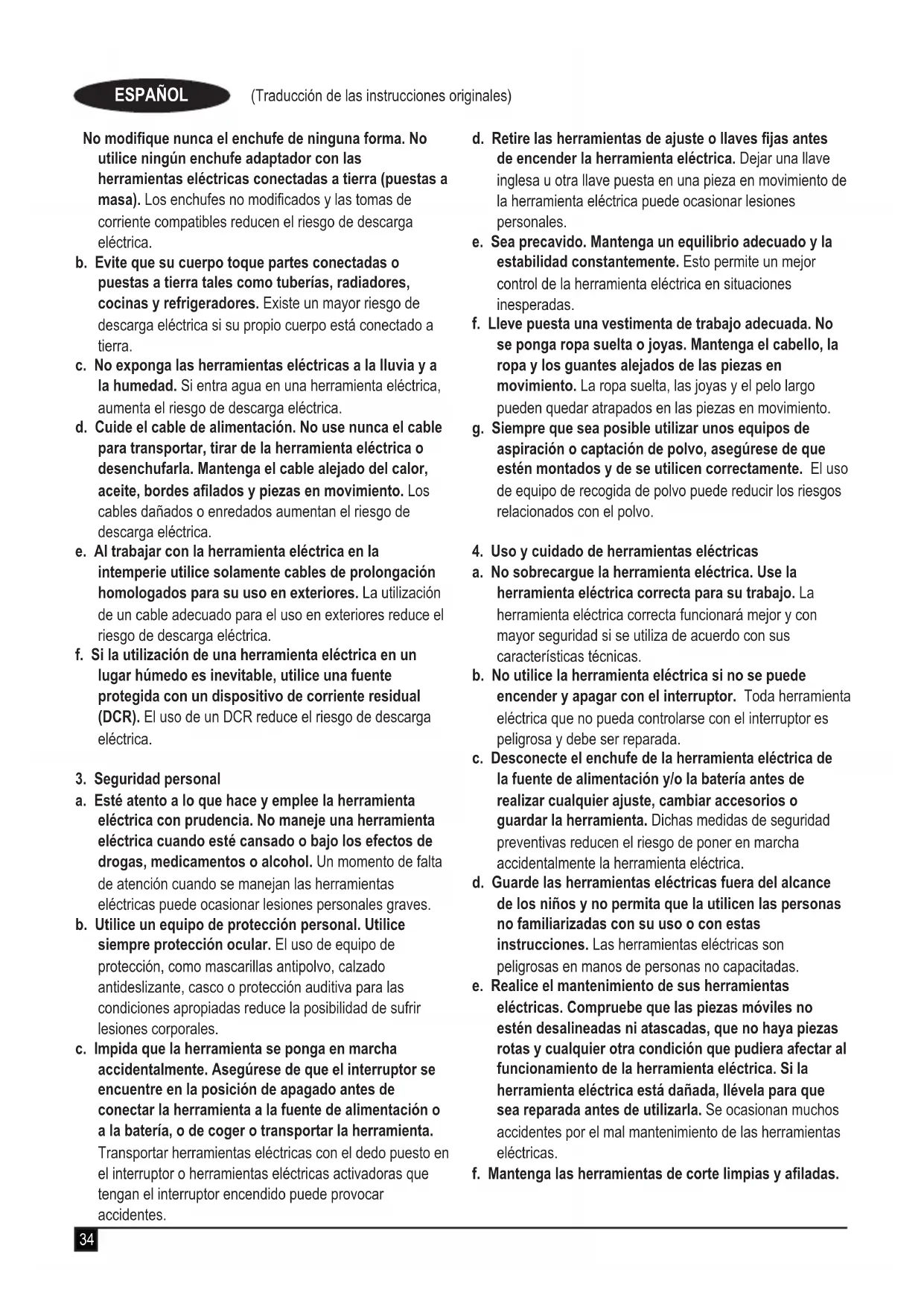 a. No sobrecargue la herramienta eléctrica. Use la herramienta eléctrica correcta para su trabajo. La herramienta eléctrica correcta funcionará mejor y con mayor seguridad si se utiliza de acuerdo con sus características técnicas. b. No utilice la herramienta eléctrica si no se puede encender y apagar con el interruptor. Toda herramienta eléctrica que no pueda controlarse con el interruptor es peligrosa y debe ser reparada. c. Desconecte el enchufe de la herramienta eléctrica de la fuente de alimentación y/o la batería antes de realizar cualquier ajuste, cambiar accesorios o guardar la herramienta. Dichas medidas de seguridad preventivas reducen el riesgo de poner en marcha accidentalmente la herramienta eléctrica. d. Guarde las herramientas eléctricas fuera del alcance de los niños y no permita que la utilicen las personas no familiarizadas con su uso o con estas instrucciones. Las herramientas eléctricas son peligrosas en manos de personas no capacitadas. e. Realice el mantenimiento de sus herramientas eléctricas. Compruebe que las piezas móviles no estén desalineadas ni atascadas, que no haya piezas rotas y cualquier otra condición que pudiera afectar al funcionamiento de la herramienta eléctrica. Si la herramienta eléctrica está dañada, llévela para que sea reparada antes de utilizarla. Se ocasionan muchos accidentes por el mal mantenimiento de las herramientas eléctricas. f. Mantenga las herramientas de corte limpias y aladas.35 (Traducción de las instrucciones originales) ESPAÑOL Hay menos probabilidad de que las herramientas de cortar con bordes alados se bloqueen, y son más fáciles de controlar. g. Utilice la herramienta eléctrica, los accesorios, los útiles de la herramienta, etc. de acuerdo con estas instrucciones, y tenga en cuenta las condiciones de trabajo y la tarea que va a realizar. El uso de la herramienta eléctrica para operaciones que no sean las previstas puede ocasionar una situación peligrosa.