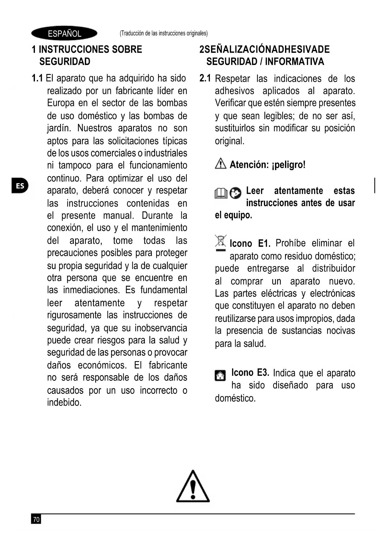 Respetar las indicaciones de los adhesivos aplicados al aparato. Verificar que estén siempre presentes y que sean legibles; de no ser así, sustituirlos sin modificar su posición original. Atención: ¡peligro! Leer atentamente estas instrucciones antes de usar el equipo. Icono E1. Prohíbe eliminar el aparato como residuo doméstico; puede entregarse al distribuidor al comprar un aparato nuevo. Las partes eléctricas y electrónicas que constituyen el aparato no deben reutilizarse para usos impropios, dada la presencia de sustancias nocivas para la salud. Icono E3. Indica que el aparato ha sido diseñado para uso doméstico.71 ESPAÑOL (Traducción de las instrucciones originales)