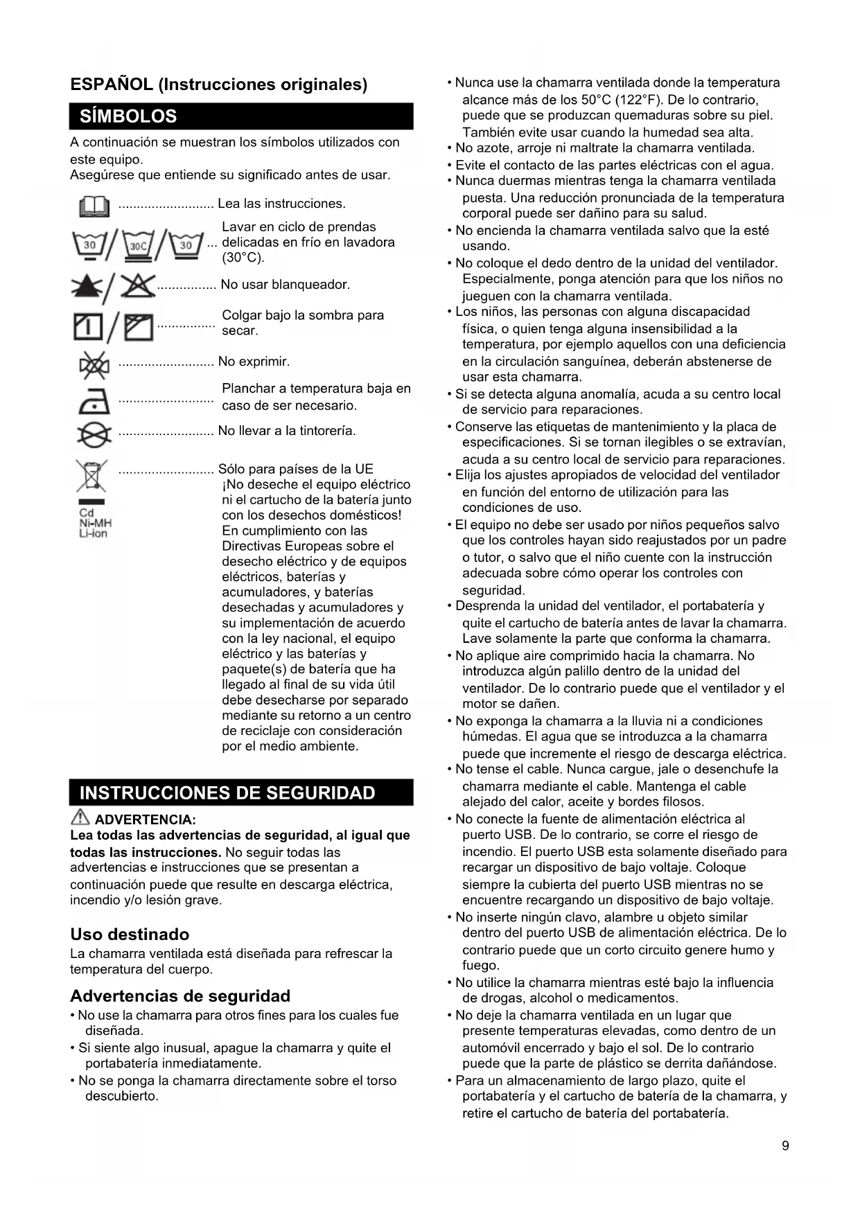 - Los niños, las personas con una incapacidad fisica, o quienonga una insensibility a la temperatura, por exemple aquellos con una deficiencies en la circulación sanguinea,deferán abstenerse de usar esta chamarra.