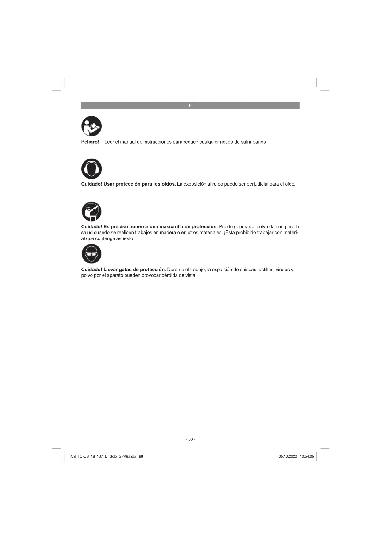 Peligro! - Leer el manual de instrucciones para reducir cualquier riesgo de sufrir daños Cuidado! Usar protección para los oídos. La exposición al ruido puede ser perjudicial para el oído. Cuidado! Llevar gafas de protección. Durante el trabajo, la expulsión de chispas, astillas, virutas y polvo por el aparato pueden provocar pérdida de vista. Cuidado! Es preciso ponerse una mascarilla de protección. Puede generarse polvo dañino para la salud cuando se realicen trabajos en madera o en otros materiales. ¡Está prohibido trabajar con materi- al que contenga asbesto! Anl_TC-OS_18_187_Li_Solo_SPK9.indb 88Anl_TC-OS_18_187_Li_Solo_SPK9.indb 88 05.10.2020 10:54:0505.10.2020 10:54:05E