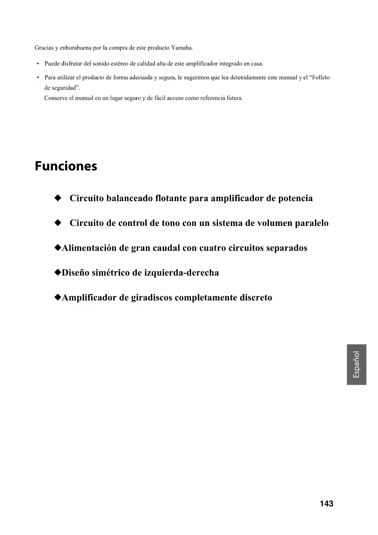 - Puede que en el embalaje se incluyan varios cables de alimentación en función de la zona de distribución. Utilice el que sea adecuado para su toma de CA. Contenido Funciones . . . . . . . . . . . . . . . . . . . . . . . . . . . . . 143 Información importante antes de usar este producto. . . . . . . . . . . . . . . . . . . . . . . . . . 144 Acerca de este manual . . . . . . . . . . . . . . . . . . . . 144Accesorios suministrados . . . . . . . . . . . . . . . . . 144 Nombres y funciones de las piezas . . . . . . 145 Panel delantero . . . . . . . . . . . . . . . . . . . . . . . . . . 146Panel trasero . . . . . . . . . . . . . . . . . . . . . . . . . . . . . 150Mando a distancia . . . . . . . . . . . . . . . . . . . . . . . . 152Instalación de las pilas en el mando a distancia . . . . . . . . . . . . . . . . . . . . . . . . . . . . . . . .154Control del mando a distancia . . . . . . . . . . .154 Conexiones . . . . . . . . . . . . . . . . . . . . . . . . . . . . 155 Diagrama de conexiones. . . . . . . . . . . . . . . . . . 156Conexión de los altavoces. . . . . . . . . . . . . . . . . 158Uso de los cables de altavoces . . . . . . . . . . .158Mediante conectores tipo banana. . . . . . . . 159Mediante cables de lengüeta en Y. . . . . . . . 159Conexión bicable. . . . . . . . . . . . . . . . . . . . . . . . . .159Conexión de activación . . . . . . . . . . . . . . . . . . . .160Conexión remota. . . . . . . . . . . . . . . . . . . . . . . . . .160Control de la unidad desde otra habitación . . . . . . . . . . . . . . . . . . . . . . . . . . . . . . 160Conexión remota entre componentes Yamaha. . . . . . . . . . . . . . . . . . . . . . . . . . . . . . . . . 161Conexión del cable de alimentación . . . . . . . .161 Apéndice . . . . . . . . . . . . . . . . . . . . . . . . . . . . . 163 Especificaciones. . . . . . . . . . . . . . . . . . . . . . . . . . .164Diagrama en bloques. . . . . . . . . . . . . . . . . . . . . .166Características acústicas . . . . . . . . . . . . . . . . . . .167Características de control de tono . . . . . . . 167Distorsión armónica total. . . . . . . . . . . . . . . . 167Distorsión armónica total (PHONO) . . . . . . 168Resolución de problemas . . . . . . . . . . . . . . . . . .169Mantenimiento . . . . . . . . . . . . . . . . . . . . . . . . . . .170 NotaEspañol