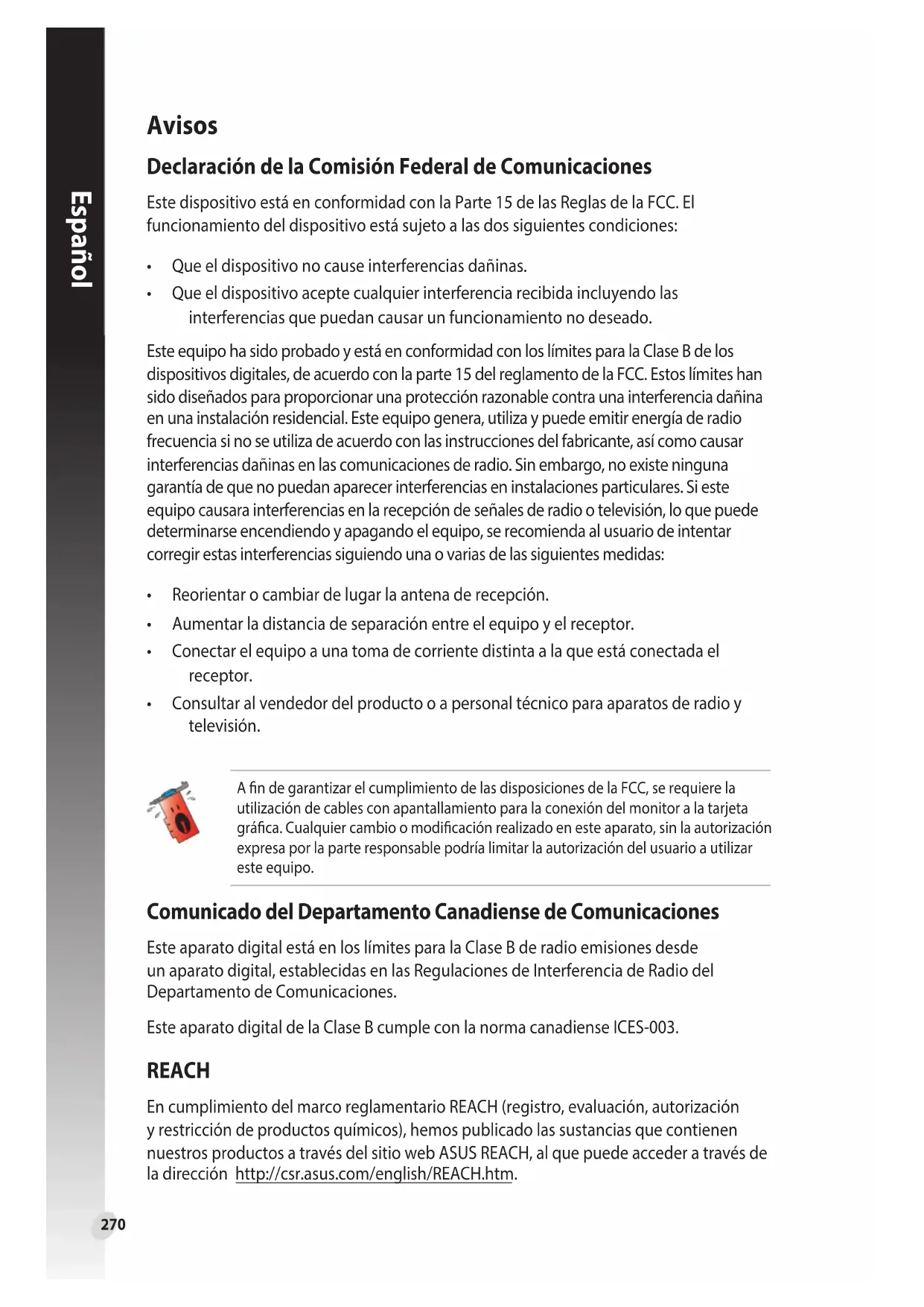 - Consultaralvendedordelproductooapersonaltécnicoparaaparatosderadioy televisión. Comunicado del Departamento Canadiense de Comunicaciones Este aparato digital está en los límites para la Clase B de radio emisiones desde un aparato digital, establecidas en las Regulaciones de Interferencia de Radio del Departamento de Comunicaciones. Este aparato digital de la Clase B cumple con la norma canadiense ICES-003. A n de garantizar el cumplimiento de las disposiciones de la FCC, se requiere la utilizacióndecablesconapantallamientoparalaconexióndelmonitoralatarjeta gráca. Cualquier cambio o modicación realizado en este aparato, sin la autorización expresaporlaparteresponsablepodríalimitarlaautorizacióndelusuarioautilizar este equipo. REACH En cumplimiento del marco reglamentario REACH (registro, evaluación, autorización y restricción de productos químicos), hemos publicado las sustancias que contienen nuestros productos a través del sitio web ASUS REACH, al que puede acceder a través de la dirección http://csr.asus.com/english/REACH.htm.271 Español Información de seguridad Seguridad del sistema eléctrico