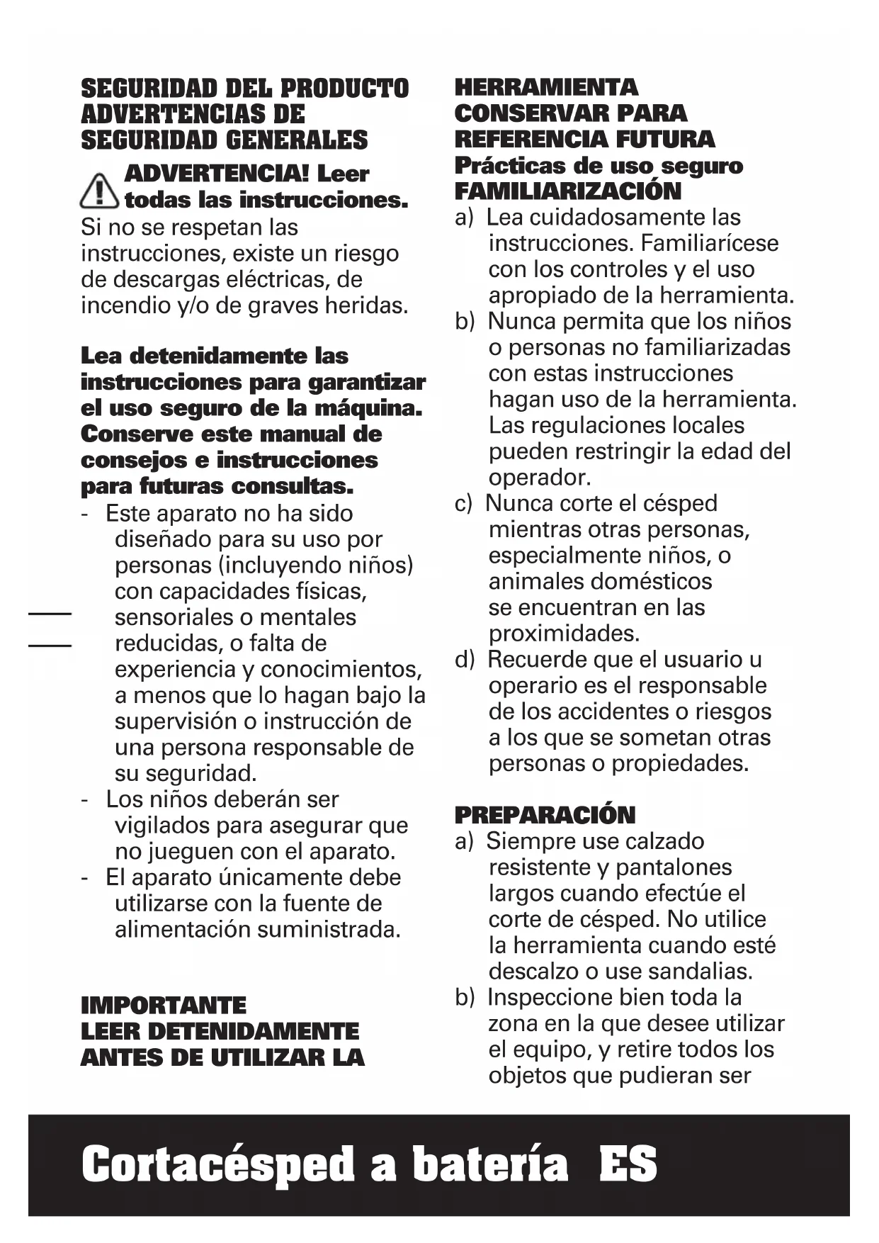 HERRAMIENTA CONSERVAR PARA REFERENCIA FUTURA Prácticas de uso seguro FAMILIARIZACIÓN a) Lea cuidadosamente las instrucciones. Familiarícese con los controles y el uso apropiado de la herramienta. b) Nunca permita que los niños o personas no familiarizadas con estas instrucciones hagan uso de la herramienta. Las regulaciones locales pueden restringir la edad del operador. c) Nunca corte el césped mientras otras personas, especialmente niños, o animales domésticos se encuentran en las proximidades. d) Recuerde que el usuario u operario es el responsable de los accidentes o riesgos a los que se sometan otras personas o propiedades. PREPARACIÓN a) Siempre use calzado resistente y pantalones largos cuando efectúe el corte de césped. No utilice la herramienta cuando esté descalzo o use sandalias. b) Inspeccione bien toda la zona en la que desee utilizar el equipo, y retire todos los objetos que pudieran ser6362 Cortacésped a batería ES lanzados por la máquina; c) Antes del uso, siempre examine visualmente la herramienta a fin de comprobar que las cuchillas, los pernos de las cuchillas y la unidad de corte no estén desgastados o dañados. A fin de evitar posibles desequilibrios, las cuchillas y los pernos desgastados o dañados deben ser reemplazados por juegos completos; Sustituya las etiquetas dañadas o ilegibles. FUNCIONAMIENTO a) Trabaje únicamente de día o con buena luz artificial. b) Cuando sea posible, evite manejar la herramienta sobre césped mojado. c) Asegúrese de no perder el equilibrio en las pendientes. d) Camine, no corra; e) En máquinas giratorias con ruedas, corte en dirección perpendicular a la pendiente, nunca hacia arriba y hacia abajo; f) Observe extrema precaución al cambiar de dirección en las pendientes. g) No trabaje sobre pendientes excesivamente empinadas. h) Tenga mucho cuidado al invertir la marcha de la herramienta o al desplazarla hacia Ud.