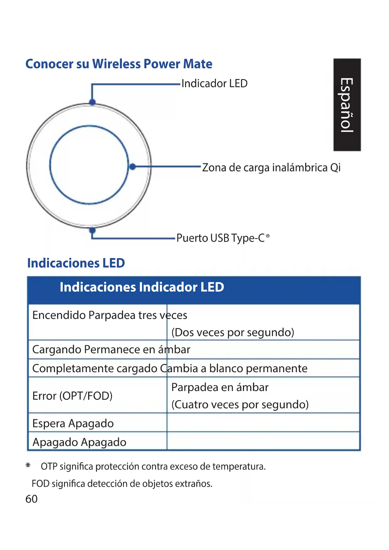 OTP signica protección contra exceso de temperatura. FOD signica detección de objetos extraños. Español61 Estándar de carga inalámbrica Qi 1.2.4 Temperatura de carga