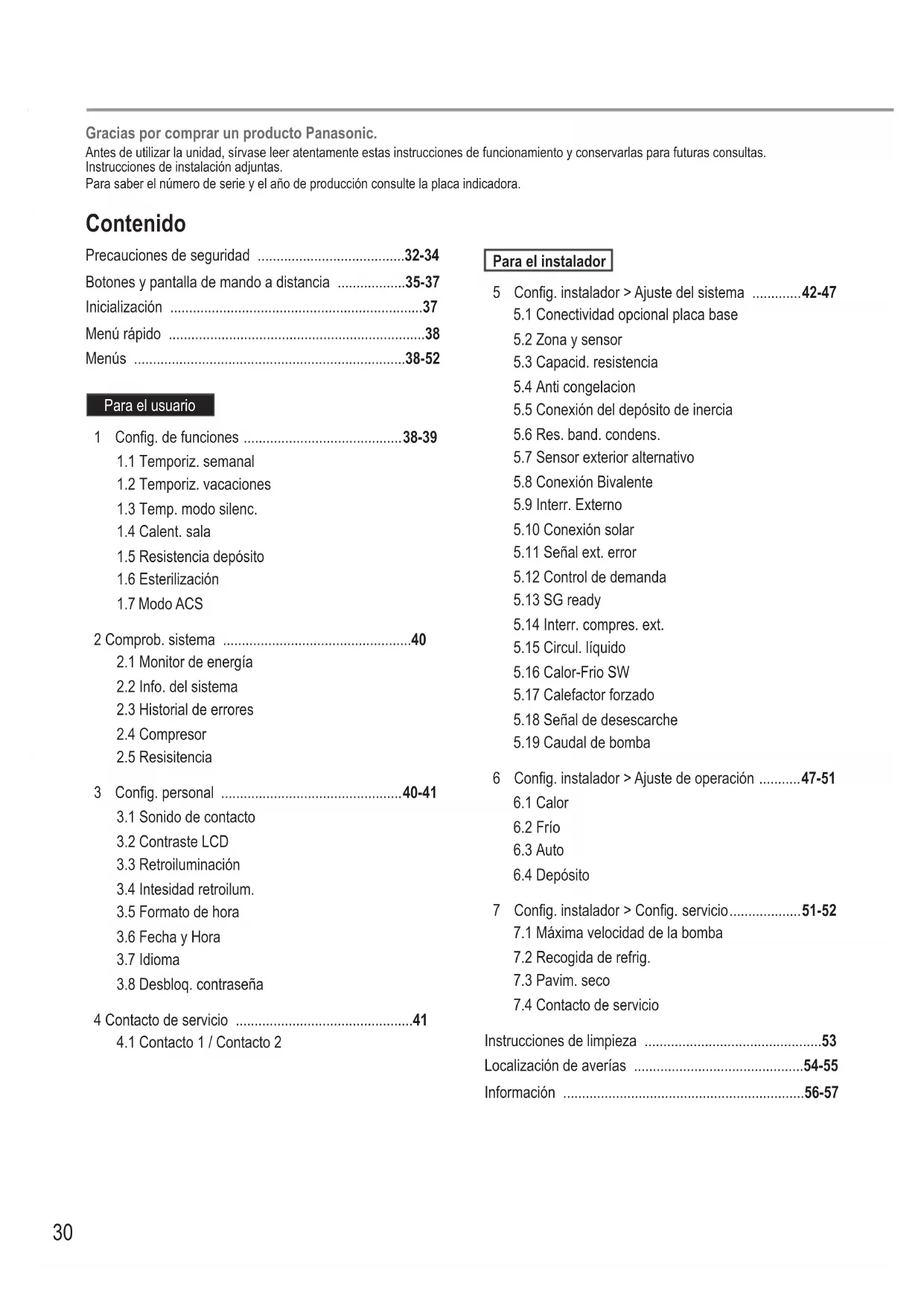 Instrucciones de limpieza ...............................................53 Localización de averías .............................................54-55 Información ................................................................56-57 Gracias por comprar un producto Panasonic. Antes de utilizar la unidad, sírvase leer atentamente estas instrucciones de funcionamiento y conservarlas para futuras consultas. Instrucciones de instalación adjuntas. Para saber el número de serie y el año de producción consulte la placa indicadora.31
