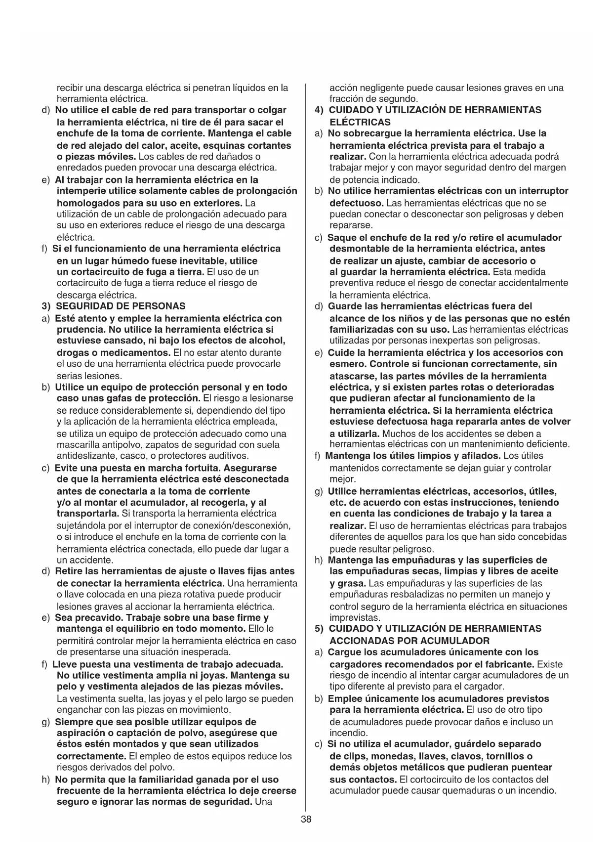 a) Cargue los acumuladores únicamente con los cargadores recomendados por el fabricante. Existe riesgo de incendio al intentar cargar acumuladores de un tipo diferente al previsto para el cargador. b) Emplee únicamente los acumuladores previstos para la herramienta eléctrica. El uso de otro tipo de acumuladores puede provocar daños e incluso un incendio. c) Si no utiliza el acumulador, guárdelo separado de clips, monedas, llaves, clavos, tornillos o demás objetos metálicos que pudieran puentear sus contactos. El cortocircuito de los contactos del acumulador puede causar quemaduras o un incendio. recibir una descarga eléctrica si penetran líquidos en la herramienta eléctrica. d) No utilice el cable de red para transportar o colgar la herramienta eléctrica, ni tire de él para sacar el enchufe de la toma de corriente. Mantenga el cable de red alejado del calor, aceite, esquinas cortantes o piezas móviles. Los cables de red dañados o enredados pueden provocar una descarga eléctrica. e) Al trabajar con la herramienta eléctrica en la intemperie utilice solamente cables de prolongación homologados para su uso en exteriores. La utilización de un cable de prolongación adecuado para su uso en exteriores reduce el riesgo de una descarga eléctrica. f) Si el funcionamiento de una herramienta eléctrica en un lugar húmedo fuese inevitable, utilice un cortacircuito de fuga a tierra. El uso de un cortacircuito de fuga a tierra reduce el riesgo de descarga eléctrica.