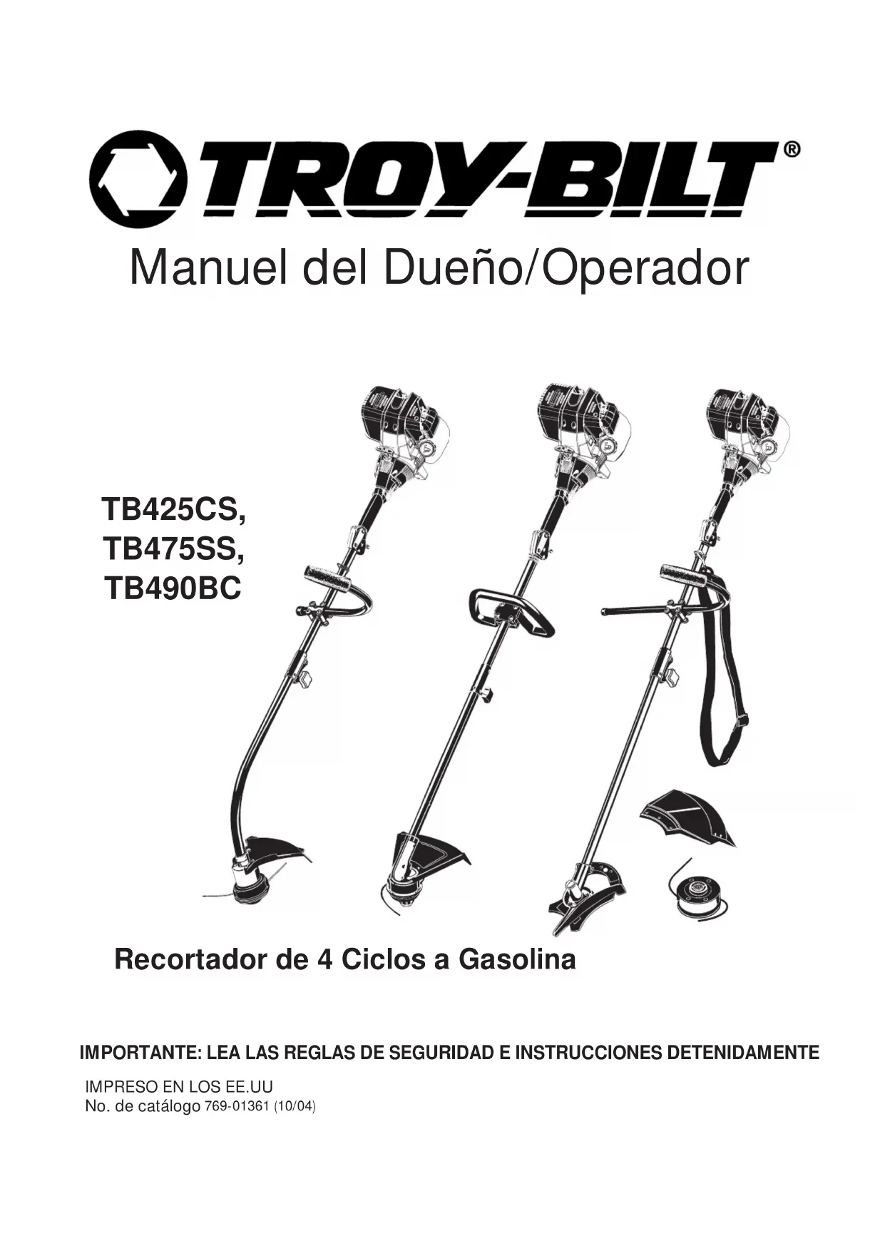 No. de catálogo 769-01361 (10/04) IMPORTANTE: LEA LAS REGLAS DE SEGURIDAD E INSTRUCCIONES DETENIDAMENTE TB425CS, TB475SS, TB490BC Recortador de 4 Ciclos a GasolinaE2 INTRODUCCION Copie el número del modelo/ pieza del fabricante aquí: Copie el número de serie aquí: MUCHAS GRACIAS Gracias por haber adquirido este gran producto. Esta moderna herramienta motriz de exteriores está diseñada para brindarle muchas horas de servicio útil. Usted comprobará que es un artefacto que le ahorrará mucho trabajo. Este manual del operador le brinda instrucciones de operación de fácil comprensión. Lea todo el manual y siga todas las instrucciones para mantener su nueva herramienta motriz de exteriores en las mejores condiciones de funcionamiento.