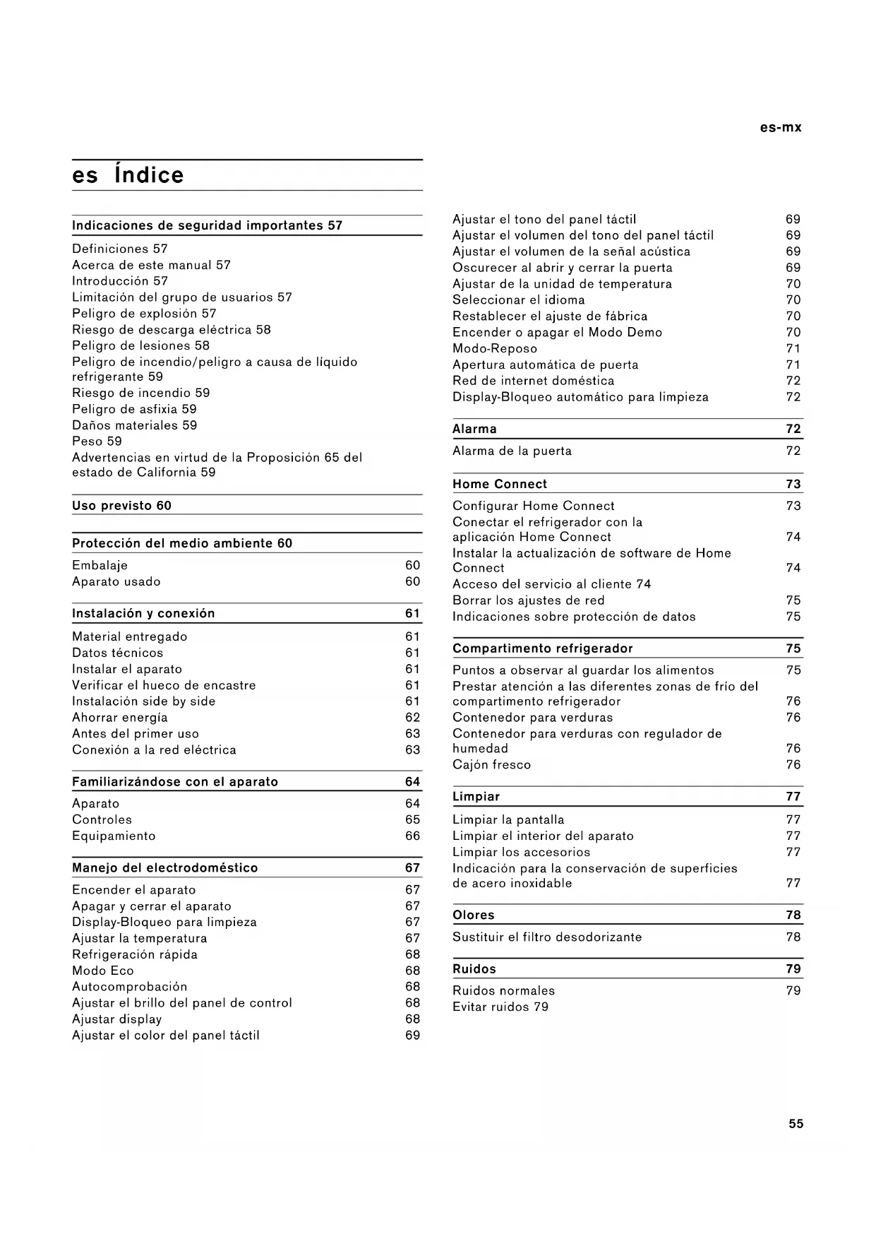 É-U 877 442 4436 Sans frais55 es-mx es Índice es Instrucciones de uso Indicaciones de seguridad importantes 57 Definiciones 57 Acerca de este manual 57 Introducción 57 Limitación del grupo de usuarios 57 Peligro de explosión 57 Riesgo de descarga eléctrica 58 Peligro de lesiones 58 Peligro de incendio/peligro a causa de líquido refrigerante 59 Riesgo de incendio 59 Peligro de asfixia 59 Daños materiales 59 Peso 59 Advertencias en virtud de la Proposición 65 del estado de California 59 Uso previsto 60 Protección del medio ambiente 60 Embalaje 60 Aparato usado 60 Instalación y conexión 61 Material entregado 61 Datos técnicos 61 Instalar el aparato 61 Verificar el hueco de encastre 61 Instalación side by side 61 Ahorrar energía 62 Antes del primer uso 63 Conexión a la red eléctrica 63 Familiarizándose con el aparato 64 Aparato 64 Controles 65 Equipamiento 66 Manejo del electrodoméstico 67 Encender el aparato 67 Apagar y cerrar el aparato 67 Display-Bloqueo para limpieza 67 Ajustar la temperatura 67 Refrigeración rápida 68 Modo Eco 68 Autocomprobación 68 Ajustar el brillo del panel de control 68 Ajustar display 68 Ajustar el color del panel táctil 69 Ajustar el tono del panel táctil 69 Ajustar el volumen del tono del panel táctil 69 Ajustar el volumen de la señal acústica 69 Oscurecer al abrir y cerrar la puerta 69 Ajustar de la unidad de temperatura 70 Seleccionar el idioma 70 Restablecer el ajuste de fábrica 70 Encender o apagar el Modo Demo 70 Modo-Reposo 71 Apertura automática de puerta 71 Red de internet doméstica 72 Display-Bloqueo automático para limpieza 72 Alarma 72 Alarma de la puerta 72 Home Connect 73 Configurar Home Connect 73 Conectar el refrigerador con la aplicación Home Connect 74 Instalar la actualización de software de Home Connect 74 Acceso del servicio al cliente 74 Borrar los ajustes de red 75 Indicaciones sobre protección de datos 75 Compartimento refrigerador 75 Puntos a observar al guardar los alimentos 75 Prestar atención a las diferentes zonas de frío del compartimento refrigerador 76 Contenedor para verduras 76 Contenedor para verduras con regulador de humedad 76 Cajón fresco 76 Limpiar 77 Limpiar la pantalla 77 Limpiar el interior del aparato 77 Limpiar los accesorios 77 Indicación para la conservación de superficies de acero inoxidable 77 Olores 78 Sustituir el filtro desodorizante 78 Ruidos 79 Ruidos normales 79 Evitar ruidos 7956 es-mx Iluminación 79 ¿Qué hacer en caso de avería? 80 Aparato 80 Servicio al cliente 81 Autoprueba del aparato 81 Solicitud de reparación y asesoramiento en caso de averías 8157 9 Indicaciones de seguridad importantes ¡LEER Y CONSERVAR ESTAS INDICACIONES!