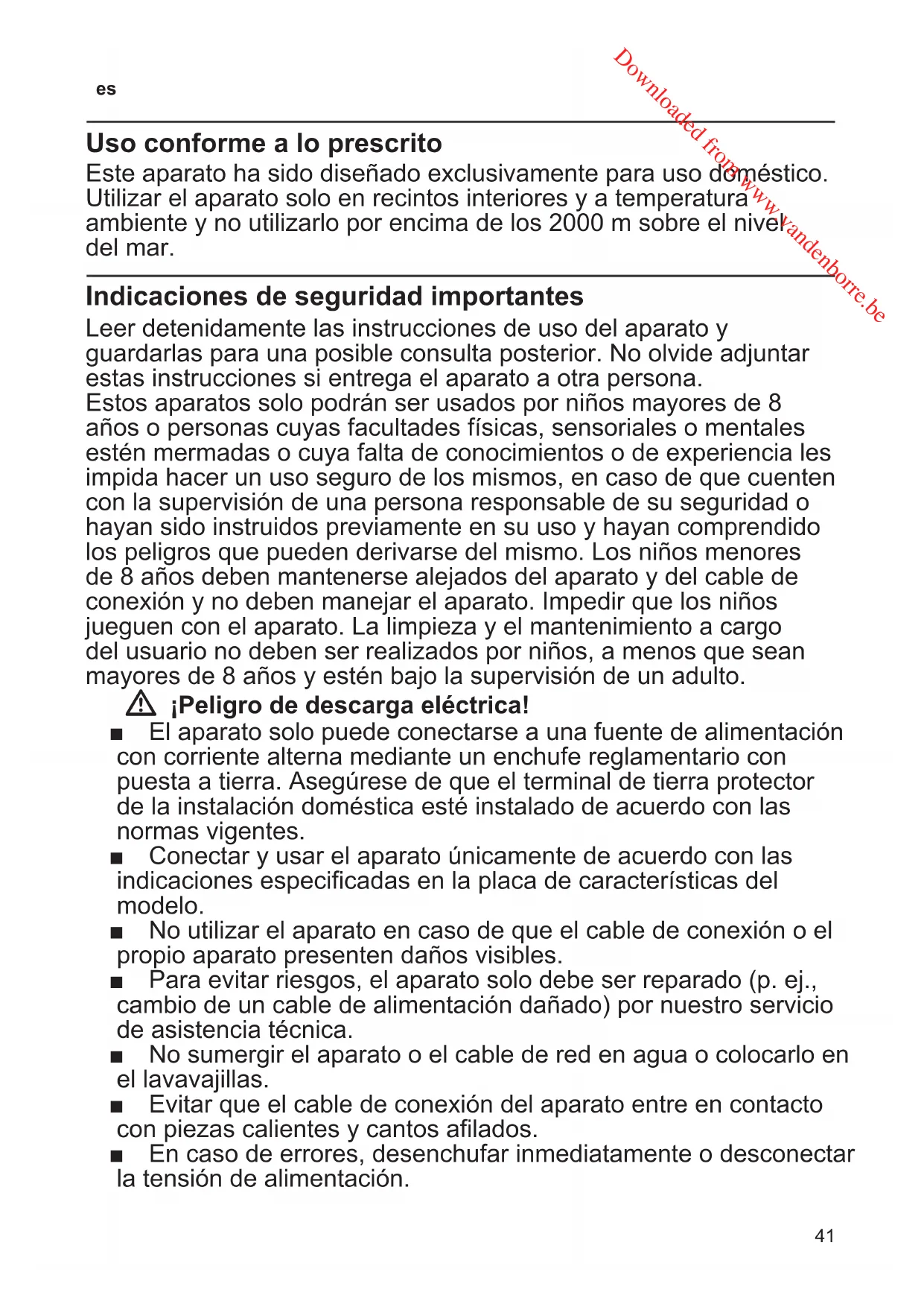 Uso conforme a lo prescrito Este aparato ha sido diseñado exclusivamente para uso doméstico. Utilizar el aparato solo en recintos interiores y a temperatura ambiente y no utilizarlo por encima de los 2000 m sobre el nivel del mar. Indicaciones de seguridad importantes Leer detenidamente las instrucciones de uso del aparato y guardarlas para una posible consulta posterior. No olvide adjuntar estas instrucciones si entrega el aparato a otra persona. Estos aparatos solo podrán ser usados por niños mayores de 8 años o personas cuyas facultades físicas, sensoriales o mentales estén mermadas o cuya falta de conocimientos o de experiencia les impida hacer un uso seguro de los mismos, en caso de que cuenten con la supervisión de una persona responsable de su seguridad o hayan sido instruidos previamente en su uso y hayan comprendido los peligros que pueden derivarse del mismo. Los niños menores de 8 años deben mantenerse alejados del aparato y del cable de conexión y no deben manejar el aparato. Impedir que los niños jueguen con el aparato. La limpieza y el mantenimiento a cargo del usuario no deben ser realizados por niños, a menos que sean mayores de 8 años y estén bajo la supervisión de un adulto. W ¡Peligro de descarga eléctrica! ■ El aparato solo puede conectarse a una fuente de alimentación con corriente alterna mediante un enchufe reglamentario con puesta a tierra. Asegúrese de que el terminal de tierra protector de la instalación doméstica esté instalado de acuerdo con las normas vigentes. ■ Conectar y usar el aparato únicamente de acuerdo con las indicaciones especificadas en la placa de características del modelo. ■ No utilizar el aparato en caso de que el cable de conexión o el propio aparato presenten daños visibles. ■ Para evitar riesgos, el aparato solo debe ser reparado (p. ej., cambio de un cable de alimentación dañado) por nuestro servicio de asistencia técnica. ■ No sumergir el aparato o el cable de red en agua o colocarlo en el lavavajillas. ■ Evitar que el cable de conexión del aparato entre en contacto con piezas calientes y cantos afilados. ■ En caso de errores, desenchufar inmediatamente o desconectar la tensión de alimentación. Downloaded from www.vandenborre.be42