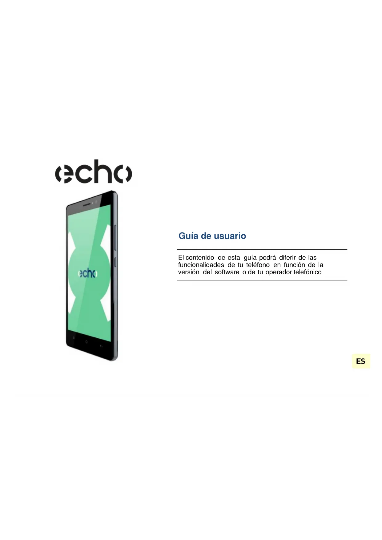 APARATO. ECHO no puede ser considerado de ninguna forma responsable del tratamiento y seguimiento de los contenidos y los servicios de terceros accesibles por medio de este aparato. Cualquier pregunta o solicitud relacionada con tales contenidos o servicios debe dirígete directamente al proveedor de los contenidos o servicios en cuestión. Un tercero independiente, el operador, proporciona la tarjeta SIM y la red o sistema (telefónico u otro) en el que funciona este aparato. ECHO renuncia expresamente a cualquier responsabilidad relativa al funcionamiento, la disponibilidad, la cobertura, los servicios o la capacidad de la red o del sistema (telefónico u otro). Si su tarjeta SIM no está en el formato válido, le aconsejamos que se pide una micro-SIM a su operador telefónico. La responsabilidad de ECHO y su servicio post-venta autorizado se limita únicamente al coste de reparación y/o de sustitución del equipo durante el periodo de garantía. ECHO no tiene ningún control sobre los contenidos y servicios que son proporcionados por terceros a través de redes o dispositivos de transmisión. Además, los servicios de terceros pueden interrumpirse o cancelarse en cualquier momento. En este sentido, ECHO no garantiza ninguna representación o garantía en cuanto a la disponibilidad del contenido de cualquier servicio de terceros y expresamente renuncia a cualquier responsabilidad en relación con dicha interrupción o suspensión.ECHO NO SE HACE RESPONSABLE EN CASO DE NEGLIGENCIA, YA SEA EN RELACION CON LA
