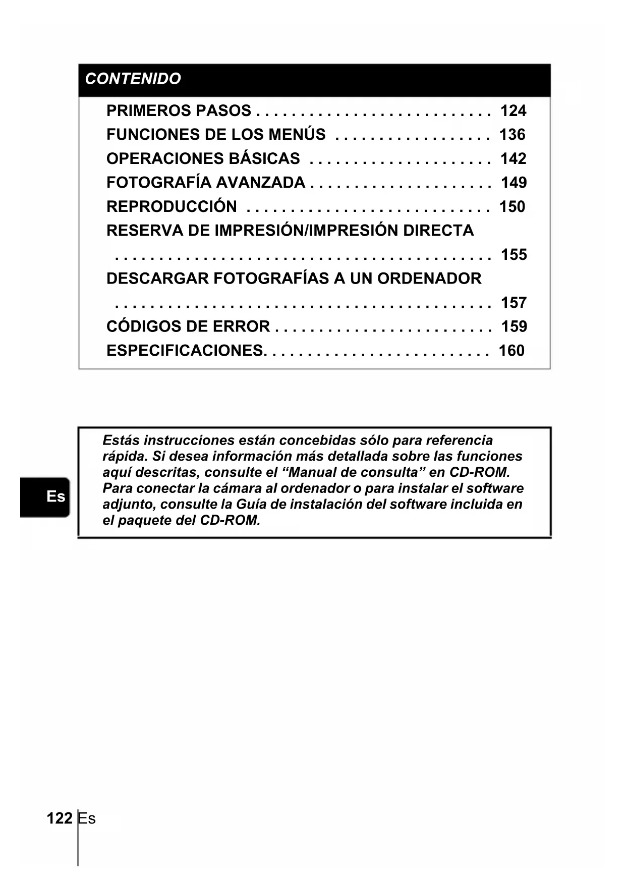 ESPECIFICACIONES. . . . . . . . . . . . . . . . . . . . . . . . . . 160 Estás instrucciones están concebidas sólo para referencia rápida. Si desea información más detallada sobre las funciones aquí descritas, consulte el “Manual de consulta” en CD-ROM. Para conectar la cámara al ordenador o para instalar el software adjunto, consulte la Guía de instalación del software incluida en el paquete del CD-ROM. x100_Basic.book 122 ページ 2004年1月21日 水曜日 午後4時13分Es 123