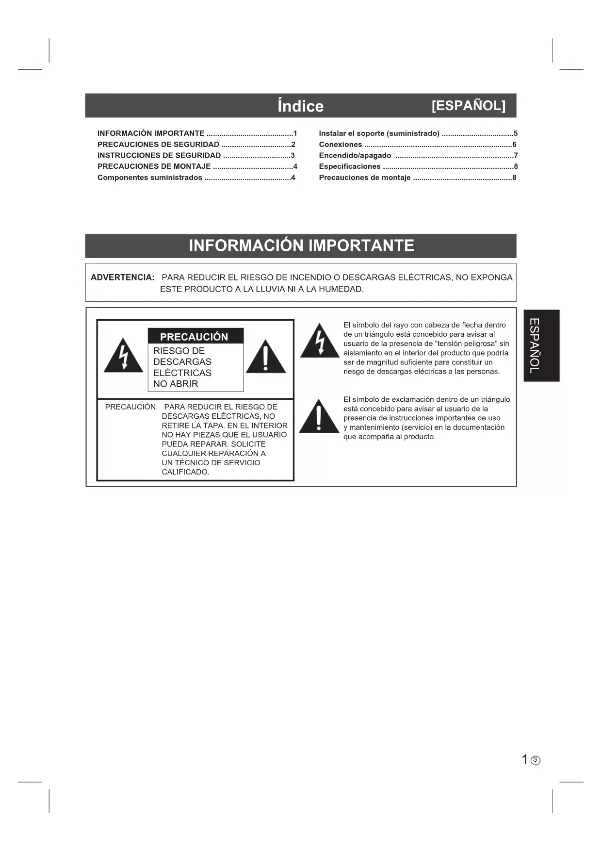 - Índice [ESPAÑOL] RIESGO DE DESCARGAS ELÉCTRICAS NO ABRIR PRECAUCIÓN PRECAUCIÓN: PARA REDUCIR EL RIESGO DE DESCARGAS ELÉCTRICAS, NO RETIRE LA TAPA. EN EL INTERIOR NO HAY PIEZAS QUE EL USUARIO PUEDA REPARAR. SOLICITE CUALQUIER REPARACIÓN A UN TÉCNICO DE SERVICIO CALIFICADO.El símbolo del rayo con cabeza de echa dentro de un triángulo está concebido para avisar al usuario de la presencia de “tensión peligrosa” sin aislamiento en el interior del producto que podría ser de magnitud suciente para constituir un riesgo de descargas eléctricas a las personas.El símbolo de exclamación dentro de un triángulo está concebido para avisar al usuario de la presencia de instrucciones importantes de uso y mantenimiento (servicio) en la documentación que acompaña al producto.INFORMACIÓN IMPORTANTE p. 1