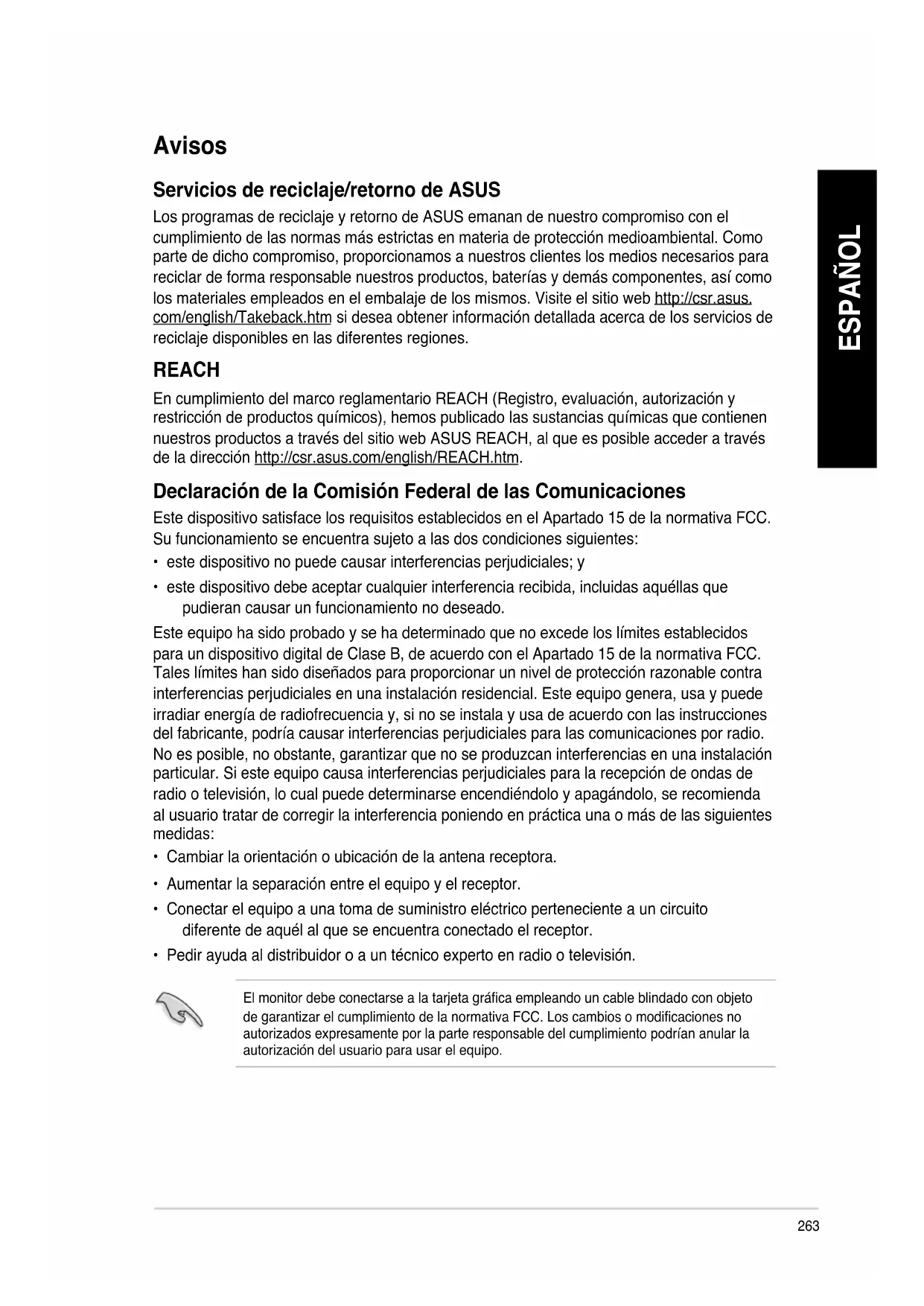 - Capítulo 7 Resolución de problemas Resolución de problemas 63 ESPAÑOL ESPAÑOL ESPAÑOL ESPAÑOL Avisos Servicios de reciclaje/retorno de ASUS Los programas de reciclaje y retorno de ASUS emanan de nuestro compromiso con el cumplimiento de las normas más estrictas en materia de protección medioambiental. Como parte de dicho compromiso, proporcionamos a nuestros clientes los medios necesarios para reciclar de forma responsable nuestros productos, baterías y demás componentes, así como los materiales empleados en el embalaje de los mismos. Visite el sitio web http://csr.asus. com/english/Takeback.htm si desea obtener información detallada acerca de los servicios de reciclaje disponibles en las diferentes regiones. REACH En cumplimiento del marco reglamentario REACH (Registro, evaluación, autorización y restricción de productos químicos), hemos publicado las sustancias químicas que contienen nuestros productos a través del sitio web ASUS REACH, al que es posible acceder a través de la dirección http://csr.asus.com/english/REACH.htm. Declaración de la Comisión Federal de las Comunicaciones Este dispositivo satisface los requisitos establecidos en el Apartado 15 de la normativa FCC. Su funcionamiento se encuentra sujeto a las dos condiciones siguientes: p. 3152