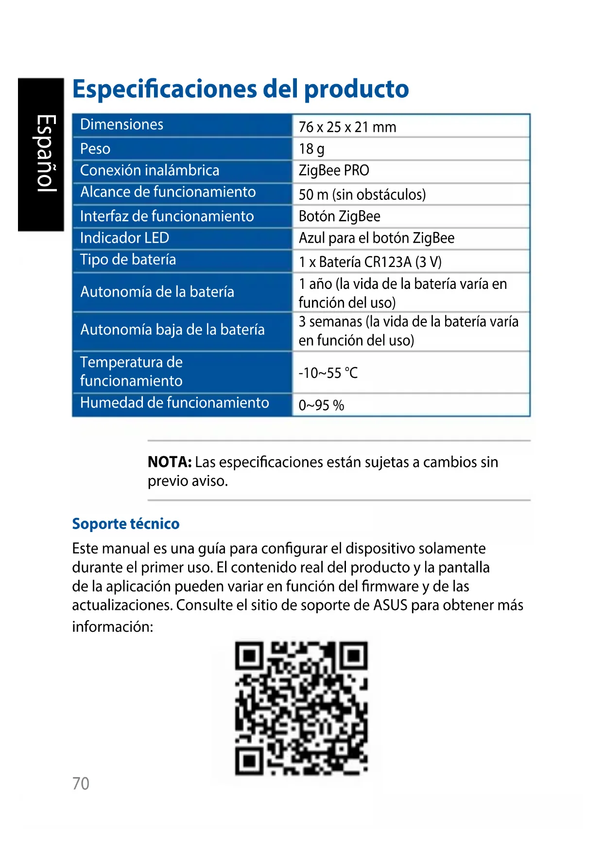 SvenskaEspañol Especicaciones del producto Dimensiones 76 x 25 x 21 mm Peso 18 g Conexión inalámbrica ZigBee PRO Alcance de funcionamiento 50 m (sin obstáculos) Interfaz de funcionamiento Botón ZigBee Indicador LED Azul para el botón ZigBee Tipo de batería 1 x Batería CR123A (3 V) Autonomía de la batería 1 año (la vida de la batería varía en función del uso) Autonomía baja de la batería 3 semanas (la vida de la batería varía en función del uso) Temperatura de funcionamiento -10~55 °C Humedad de funcionamiento 0~95 % NOTA: Las especicaciones están sujetas a cambios sin previo aviso. Soporte técnico Este manual es una guía para congurar el dispositivo solamente durante el primer uso. El contenido real del producto y la pantalla de la aplicación pueden variar en función del rmware y de las actualizaciones. Consulte el sitio de soporte de ASUS para obtener más información: 70Español Información general del producto Sensor de temperatura y humedad Mide la temperatura (-10~55 °C) y la humedad (0~95 %) interiores. Botón ZigBee Presione el botón para conectar con Home Gateway. Presione sin soltar el botón durante 5 segundos para restablecer el dispositivo. NOTA: Asegúrese de restablecer el dispositivo ASUS Smart Home y elimínelo de la aplicación complementaria para quitarlo completamente. 71Español Indicador LED ZigBee Consulte la tabla siguiente para obtener detalles sobre el indicador LED de estado: Color Estado Descripción Azul permanente Dispositivo encendiéndose Se ilumina durante 1 segundo Desconectándose de Home Gateway Mantenga presionado el botón ZigBee durante 5 segundos Identicando dispositivo Se ilumina durante 5 segundos Azul intermitente Conectándose con Home Gateway Presione el botón ZigBee para conectarse con Home Gateway 72Español Requisitos del sistema