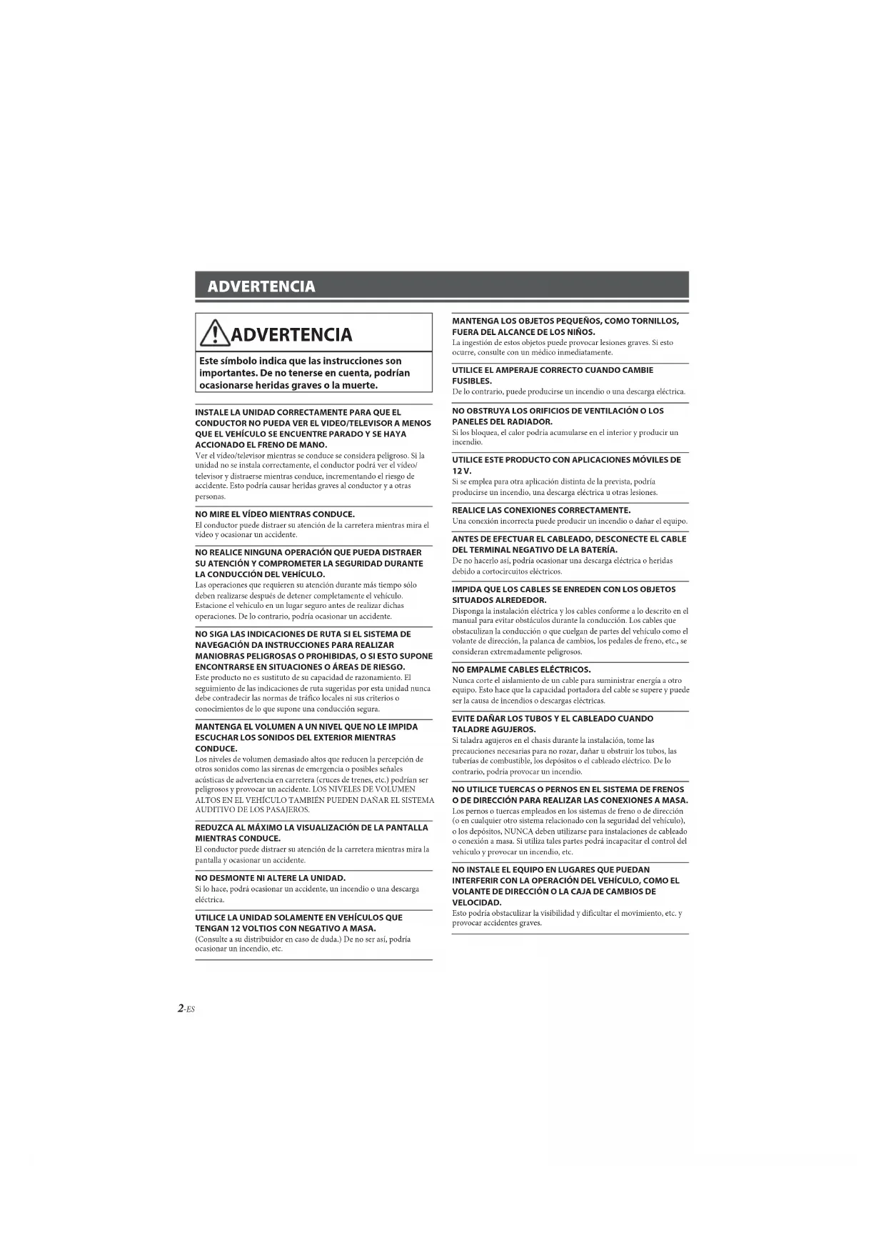 CONDUCE. Los niveles de volumen demasiado altos que reducen la percepción de otros sonidos como las sirenas de emergencia o posibles señales acústicas de advertencia en carretera (cruces de trenes, etc.) podrían ser peligrosos y provocar un accidente. LOS NIVELES DE VOLUMEN ALTOS EN EL VEHÍCULO TAMBIÉN PUEDEN DAÑAR EL SISTEMA AUDITIVO DE LOS PASAJEROS. REDUZCA AL MÁXIMO LA VISUALIZACIÓN DE LA PANTALLA MIENTRAS CONDUCE. El conductor puede distraer su atención de la carretera mientras mira la pantalla y ocasionar un accidente. NO DESMONTE NI ALTERE LA UNIDAD. Si lo hace, podrá ocasionar un accidente, un incendio o una descarga eléctrica. UTILICE LA UNIDAD SOLAMENTE EN VEHÍCULOS QUE TENGAN 12 VOLTIOS CON NEGATIVO A MASA. (Consulte a su distribuidor en caso de duda.) De no ser así, podría ocasionar un incendio, etc. MANTENGA LOS OBJETOS PEQUEÑOS, COMO TORNILLOS, FUERA DEL ALCANCE DE LOS NIÑOS. La ingestión de estos objetos puede provocar lesiones graves. Si esto ocurre, consulte con un médico inmediatamente.