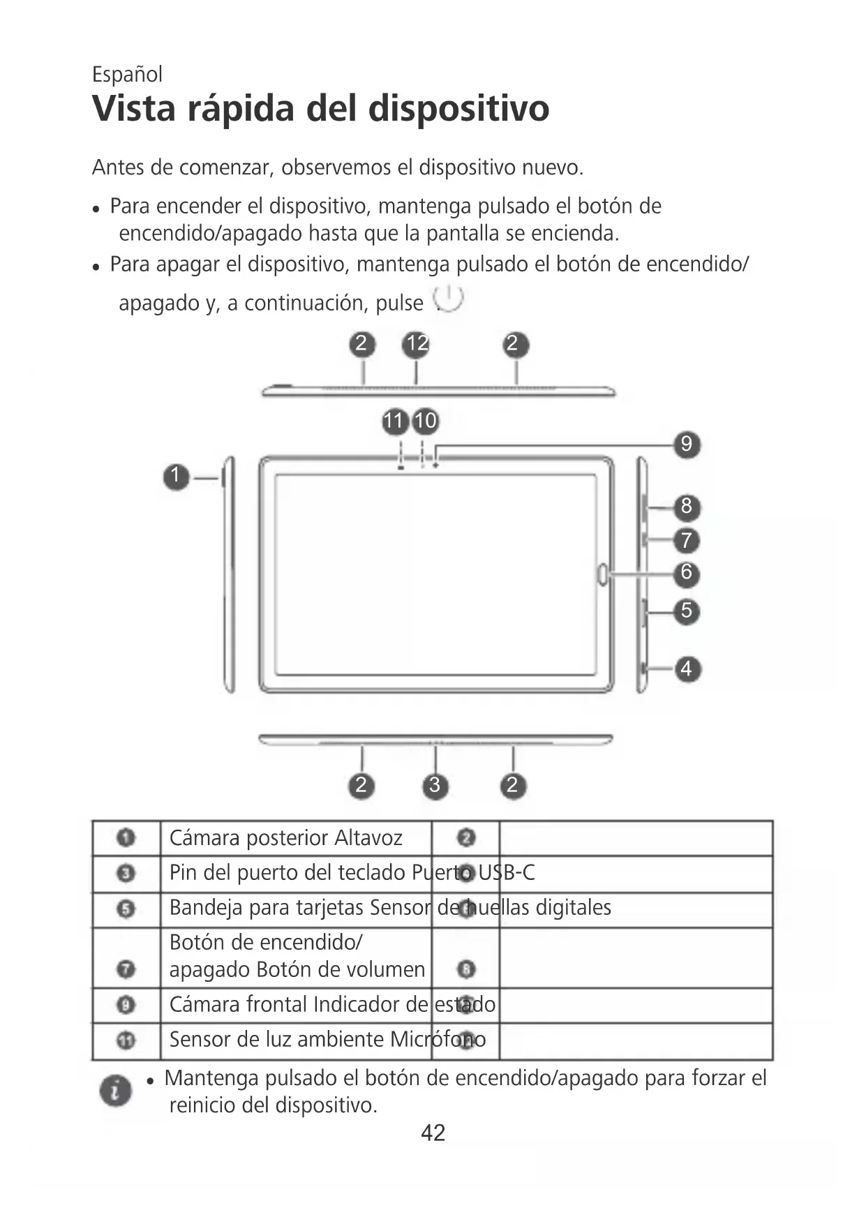 Cámara posterior Altavoz Pin del puerto del teclado Puerto USB-C Bandeja para tarjetas Sensor de huellas digitales Botón de encendido/ apagado Botón de volumen Cámara frontal Indicador de estado Sensor de luz ambiente Micrófono l Mantenga pulsado el botón de encendido/apagado para forzar el reinicio del dispositivo. Español 42Pasos iniciales Siga las instrucciones que se muestran en las guras para congurar el dispositivo. NJDSP4% Tenga cuidado al usar la herramienta para extraer la tarjeta ya que podría lastimarse o rayar el dispositivo. Guarde dicha herramienta fuera del alcance de los niños para evitar que se lastimen o la ingieran. 43Más información Si experimenta algún problema cuando utiliza el dispositivo, puede obtener ayuda de las siguientes formas: l Visite http://consumer.huawei.com/en para ver la información del dispositivo, las preguntas frecuentes y demás información. l Acceder a http://consumer.huawei.com/en/support para obtener la información de contacto más actualizada correspondiente a su país o región. l Acceda a HiCare para consultar la línea de atención del servicio, la ubicación de las tiendas minoristas, las políticas del servicio y demás información para su región. Acceder a Ajustes y pulsar Sistema > Información de la tableta > Aviso legal para consultar la información legal del producto. Acceder a Ajustes y pulsar Sistema > Información de la tableta > Aviso legal > Información de seguridad para consultar la información de seguridad del producto. Acceder a Ajustes y pulsar Sistema > Información de la tableta > Información de autenticación para consultar la información regulatoria del producto. Acceder a Ajustes y pulsar Sistema > Logotipos de certicación para consultar más información sobre los logotipos de las certicaciones del producto. Todas las imágenes e ilustraciones de esta guía, lo que incluye, a título meramente enunciativo, el color, el tamaño y los contenidos que aparecen en el producto, son solo para nes de referencia. El producto adquirido puede presentar diferencias. El contenido de esta guía no constituye garantía de ningún tipo, ni expresa ni implícita. 44Información de seguridad Lea cuidadosamente toda la información de seguridad antes de utilizar el dispositivo a n de garantizar un funcionamiento seguro y adecuado, y saber cómo desechar correctamente el dispositivo. Condiciones de uso y seguridad l Para evitar daños al oído, no escuche música a un volumen muy elevado por periodos prolongados. l El uso de baterías, cargadores o adaptadores de alimentación no autorizados o incompatibles puede dañar el dispositivo, reducir la vida útil y generar incendios, explosiones u otras situaciones peligrosas. l Las temperaturas de operación ideales oscilan entre los 0 °C y los 35 °C. Las temperaturas de almacenamiento ideales oscilan entre los -20 °C y los +45 °C. l Los fabricantes de marcapasos recomiendan mantener una distancia mínima de 15 cm entre el teléfono móvil y un marcapasos para evitar posibles interferencias. En caso de tener un marcapasos, use el teléfono en el lado opuesto y no lo lleve en el bolsillo delantero. l Mantenga el dispositivo y la batería alejados del calor excesivo y la luz directa del sol. No coloque el dispositivo sobre equipos generadores de calor, como por ejemplo, hornos microondas, cocinas o radiadores. l Cumpla con las normas y leyes locales cuando utilice el dispositivo. A n de evitar accidentes, no utilice su dispositivo inalámbrico mientras conduce. l Mientras se encuentre a bordo de un avión o inmediatamente antes de abordar, solo utilice el dispositivo de conformidad con las instrucciones proporcionadas. El uso de dispositivos inalámbricos en un avión puede interferir con las redes inalámbricas y resultar peligroso para el funcionamiento de este. Además, puede ser ilegal. l Para evitar daños en las piezas o circuitos internos del dispositivo, no lo utilice en entornos que presenten polvo, humo, humedad o suciedad ni próximos a campos magnéticos. 45l Cuando cargue el dispositivo, asegúrese de que el adaptador de alimentación esté enchufado cerca de los dispositivos y que sea de fácil acceso. l Desenchufe el cargador de la toma de energía y del dispositivo cuando no esté siendo utilizado. l No utilice, guarde ni transporte el dispositivo en áreas donde se almacenen elementos inamables o explosivos (por ejemplo, gasolineras, depósitos de aceite o plantas químicas). El uso del dispositivo en este tipo de entornos aumenta el riesgo de explosión o incendio. l Deseche este dispositivo, la batería y los accesorios de conformidad con las normas locales. No deben desecharse con los residuos domésticos comunes. El uso no adecuado de la batería puede generar incendios, explosiones u otras situaciones peligrosas. l Comuníquese con su médico y con el fabricante del dispositivo para saber si el uso de su dispositivo puede interferir con algún dispositivo médico. l Cumpla con las reglas y normas vigentes de los hospitales y centros de salud. No utilice el dispositivo en lugares donde su uso esté prohibido. l Si debe hacer o responder una llamada, primero detenga el vehículo en un sitio seguro y estaciónelo. l Mantenga el dispositivo alejado del fuego o de fuentes de calor (por ejemplo, estufas, hornos de microondas, cocinas, calentadores, radiadores o velas). Ambientes con riesgo de explosión Apague el dispositivo al encontrarse en un entorno potencialmente explosivo, y cumpla con todas las instrucciones e indicaciones pertinentes. Entre las áreas que pueden tener entornos potencialmente explosivos se encuentran aquellas en las que normalmente se le recomendaría apagar el motor de su vehículo. En estas áreas, las chispas pueden provocar explosiones o un incendio, lesiones e incluso la muerte. No encienda el dispositivo en establecimientos de recarga de combustible, como gasolineras. Respete las restricciones relativas al uso de equipos de