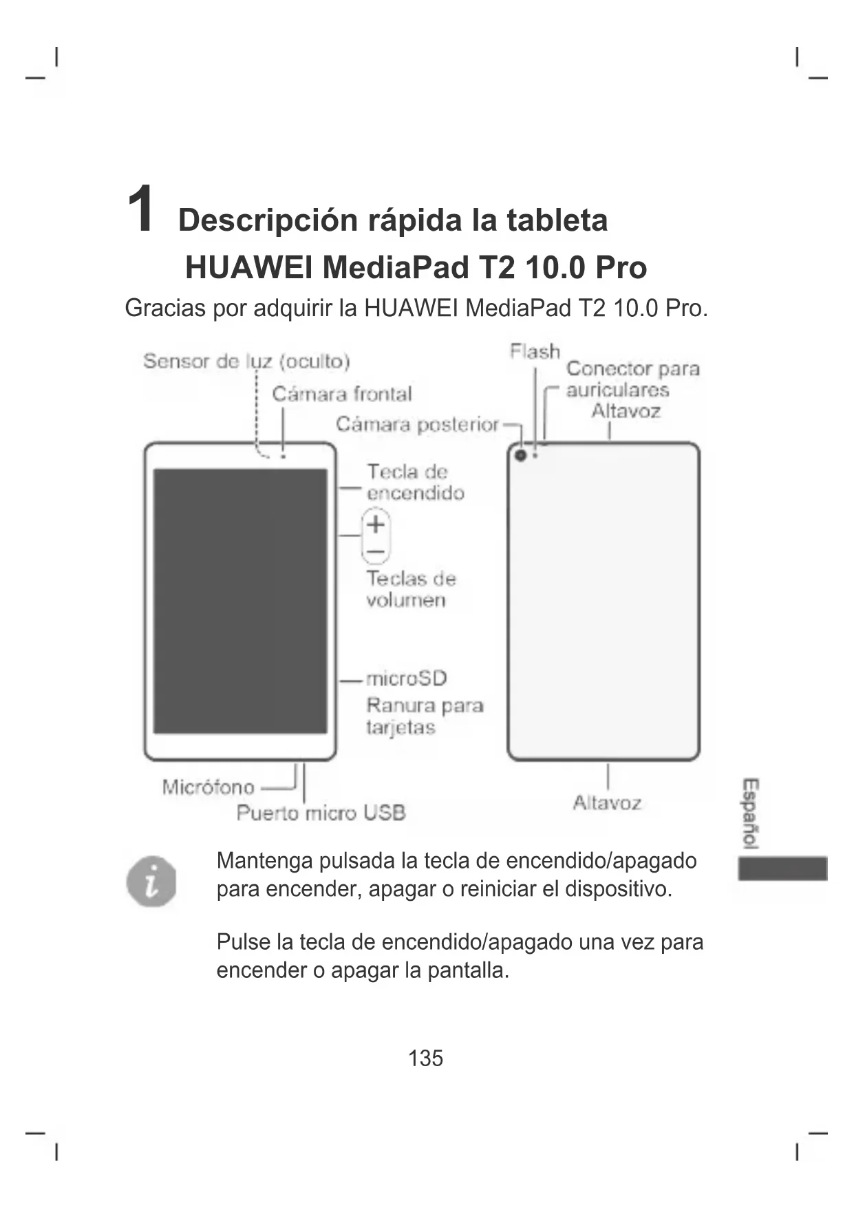 Visite http://consumer.huawei.com/en/support/hotline para obter o contacto telefónico e endereço de e-mail actualizados recentemente no seu país ou região. As ilustrações contidas neste manual são fornecidas unicamente a título de referência. O aspecto e as funcionalidades de visualização poderão variar ligeiramente, consoante a versão do produto real.135 1 Descripción rápida la tableta HUAWEI MediaPad T2 10.0 Pro Gracias por adquirir la HUAWEI MediaPad T2 10.0 Pro. Mantenga pulsada la tecla de encendido/apagado para encender, apagar o reiniciar el dispositivo. Pulse la tecla de encendido/apagado una vez para encender o apagar la pantalla.136 Evite bloquear el sensor de luz ya que puede afectar el uso normal de la T2 10.0 Pro. Seleccione un protector de pantalla que tenga un orificio para no cubrir el sensor de luz. 2 Introducción de la tarjeta microSD137 3 Carga de la batería 4 Información de seguridad Esta sección contiene información importante sobre el funcionamiento del dispositivo. Describe, además, cómo utilizar el dispositivo de manera segura. Lea esta información atentamente antes de utilizar el dispositivo. Dispositivos electrónicos No utilice el dispositivo cuando su uso esté prohibido. No utilice el dispositivo cuando su uso pueda generar situaciones peligrosas o interferir con otros dispositivos electrónicos.138 Interferencias con dispositivos médicos