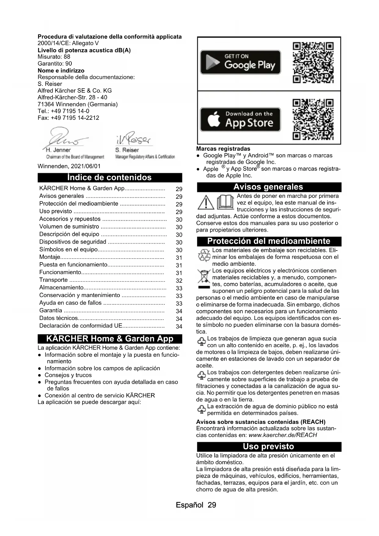 dB(A) 90 90 Control Premium Power Control K 4 Flex Power K 4 Flex PowerEspañol 29 Procedura di valutazione della conformità applicata 2000/14/CE: Allegato V Livello di potenza acustica dB(A) Misurato: 88 Garantito: 90 Nome e indirizzo Responsabile della documentazione: S. Reiser Alfred Kärcher SE & Co. KG Alfred-Kärcher-Str. 28 - 40 71364 Winnenden (Germania) Tel.: +49 7195 14-0 Fax: +49 7195 14-2212 Winnenden, 2021/06/01 Índice de contenidos KÄRCHER Home & Garden App La aplicación KÄRCHER Home & Garden App contiene: ● Información sobre el montaje y la puesta en funcio- namiento ● Información sobre los campos de aplicación ● Consejos y trucos ● Preguntas frecuentes con ayuda detallada en caso de fallos ● Conexión al centro de servicio KÄRCHER La aplicación se puede descargar aquí: Marcas registradas ● Google Play™ y Android™ son marcas o marcas registradas de Google Inc. ● Apple