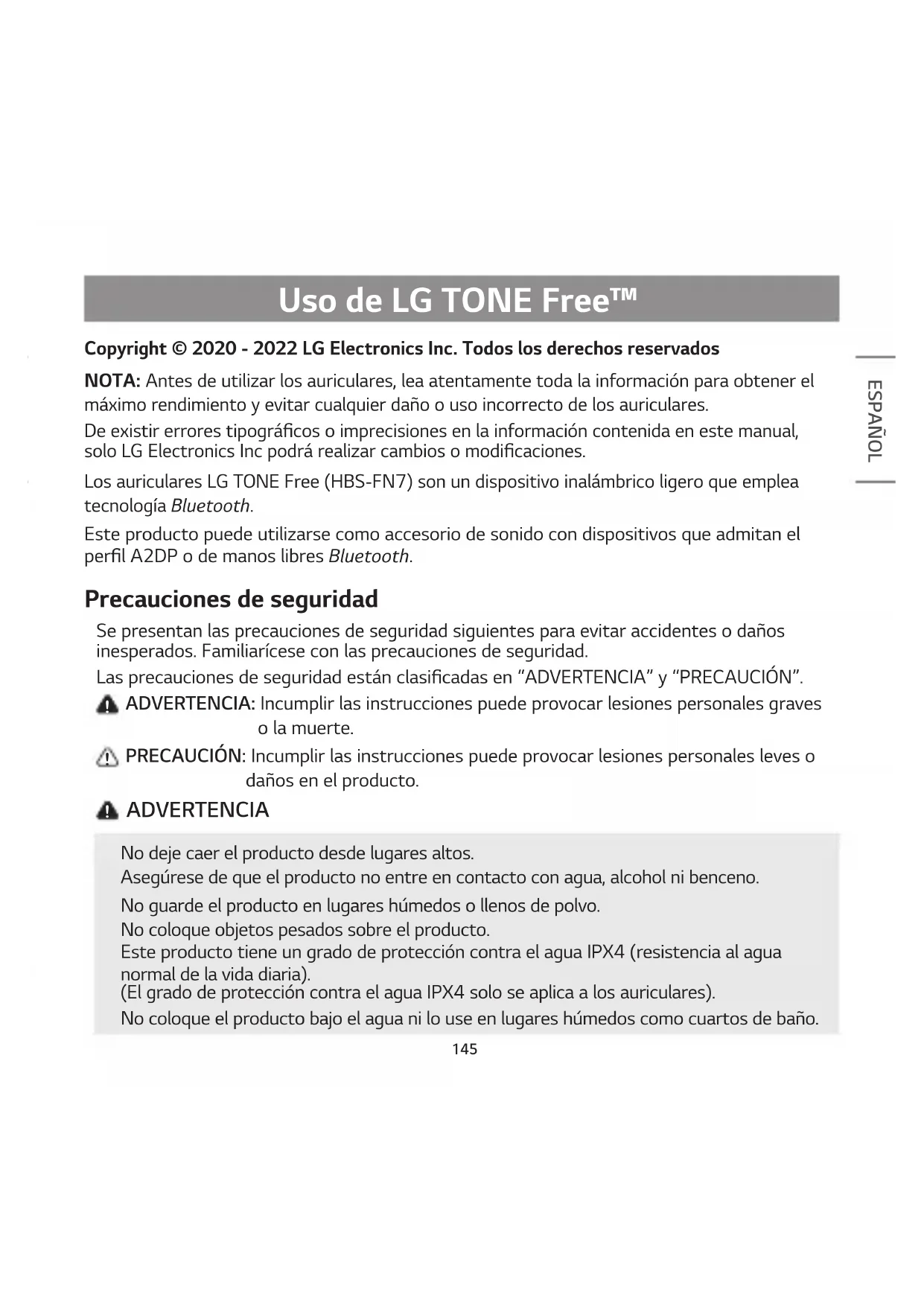 Copyright © 2020 - 2022 LG Electronics Inc. Todos los derechos reservados NOTA: Antes de utilizar los auriculares, lea atentamente toda la información para obtener el máximo rendimiento y evitar cualquier daño o uso incorrecto de los auriculares. De existir errores tipográcos o imprecisiones en la información contenida en este manual, solo LG Electronics Inc podrá realizar cambios o modicaciones. Los auriculares LG TONE Free (HBS-FN7) son un dispositivo inalámbrico ligero que emplea tecnología Bluetooth. Este producto puede utilizarse como accesorio de sonido con dispositivos que admitan el perl A2DP o de manos libres Bluetooth. Precauciones de seguridad Se presentan las precauciones de seguridad siguientes para evitar accidentes o daños inesperados. Familiarícese con las precauciones de seguridad. Las precauciones de seguridad están clasicadas en “ADVERTENCIA” y “PRECAUCIÓN”.