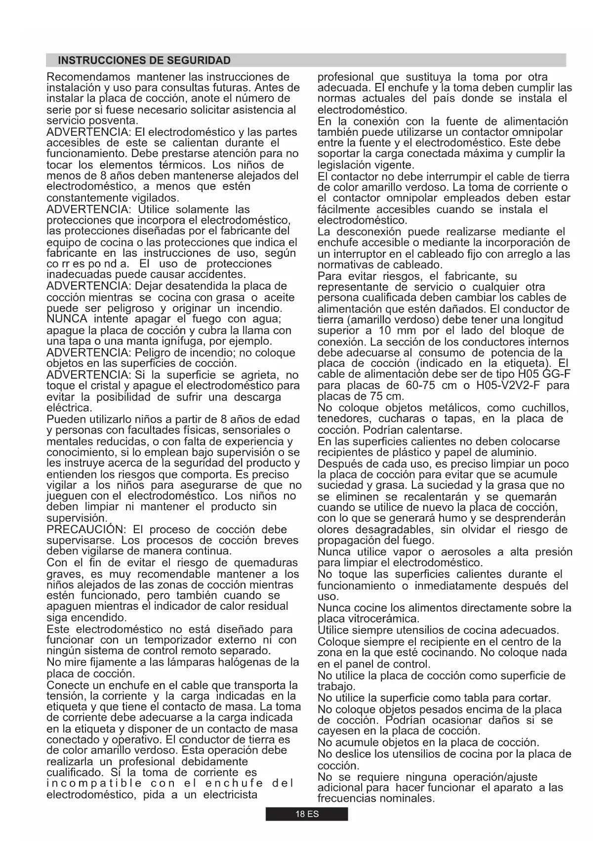 profesional que sustituya la toma por otra adecuada. El enchufe y la toma deben cumplir las normas actuales del país donde se instala el electrodoméstico. En la conexión con la fuente de alimentación también puede utilizarse un contactor omnipolar entre la fuente y el electrodoméstico. Este debe soportar la carga conectada máxima y cumplir la legislación vigente. El contactor no debe interrumpir el cable de tierra de color amarillo verdoso. La toma de corriente o el contactor omnipolar empleados deben estar fácilmente accesibles cuando se instala el electrodoméstico. La desconexión puede realizarse mediante el enchufe accesible o mediante la incorporación de un interruptor en el cableado fijo con arreglo a las normativas de cableado. Para evitar riesgos, el fabricante, su representante de servicio o cualquier otra persona cualificada deben cambiar los cables de alimentación que estén dañados. El conductor de tierra (amarillo verdoso) debe tener una longitud superior a 10 mm por el lado del bloque de conexión. La sección de los conductores internos debe adecuarse al consumo de potencia de la placa de cocción (indicado en la etiqueta). El cable de alimentación debe ser de tipo H05 GG-F para placas de 60-75 cm o H05-V2V2-F para placas de 75 cm. No coloque objetos metálicos, como cuchillos, tenedores, cucharas o tapas, en la placa de cocción. Podrían calentarse. En las superficies calientes no deben colocarse recipientes de plástico y papel de aluminio. Después de cada uso, es preciso limpiar un poco la placa de cocción para evitar que se acumule suciedad y grasa. La suciedad y la grasa que no se eliminen se recalentarán y se quemarán cuando se utilice de nuevo la placa de cocción, con lo que se generará humo y se desprenderán olores desagradables, sin olvidar el riesgo de propagación del fuego. Nunca utilice vapor o aerosoles a alta presión para limpiar el electrodoméstico. No toque las superficies calientes durante el funcionamiento o inmediatamente después del uso. Nunca cocine los alimentos directamente sobre la placa vitrocerámica. Utilice siempre utensilios de cocina adecuados. Coloque siempre el recipiente en el centro de la zona en la que esté cocinando. No coloque nada en el panel de control. No utilice la placa de cocción como superficie de trabajo. No utilice la superficie como tabla para cortar. No coloque objetos pesados encima de la placa de cocción. Podrían ocasionar daños si se cayesen en la placa de cocción. No acumule objetos en la placa de cocción. No deslice los utensilios de cocina por la placa de cocción. No se requiere ninguna operación/ajuste adicional para hacer funcionar el aparato a las frecuencias nominales.19 ES La placa puede instalarse en cualquier superficie que sea resistente al calor a 100ºC y cuyo grosor sea de entre 25 y 45 mm. Las dimensiones para el corte de la superficie y la inclusión de la placa se muestran en la Figura 2. En caso de haber espacio entre la placa incrustada y la cavidad inferior, ha de colocarse una separación divisoria hecha de un material aislante (madera o similar) (Figura 2). Si la placa se coloca entre dos armarios, la distancia entre la misma y el armario ha de ser de al menos 17 cm (60 cm) o 25 cm (75 cm) (véase Figura 2); mientras que la distancia entre la placa y la pared posterior tiene que ser de al menos 70 mm. La distancia entre la placa y otra unidad o electrodoméstico que tenga encima (por ejemplo, el extractor) tiene que ser superior a 70 cm (Figura 4). Los objetos metálicos del cajón pueden alcanzar temperaturas elevadas debido a la recirculación del aire. Por consiguiente, se recomienda utilizar un panel de madera intermedio. Importante el diagrama de la figura 1 muestra cómo ha de aplicarse el sellado. La placa se encaja con las sujeciones proporcionadas utilizando los agujeros de la base de la unidad. Cuando se coloque una placa de 60 cm o 75 cm sobre un horno, el honro ha de tener un sistema de refrigeración por ventilador. 1.1. INTEGRACIÓN