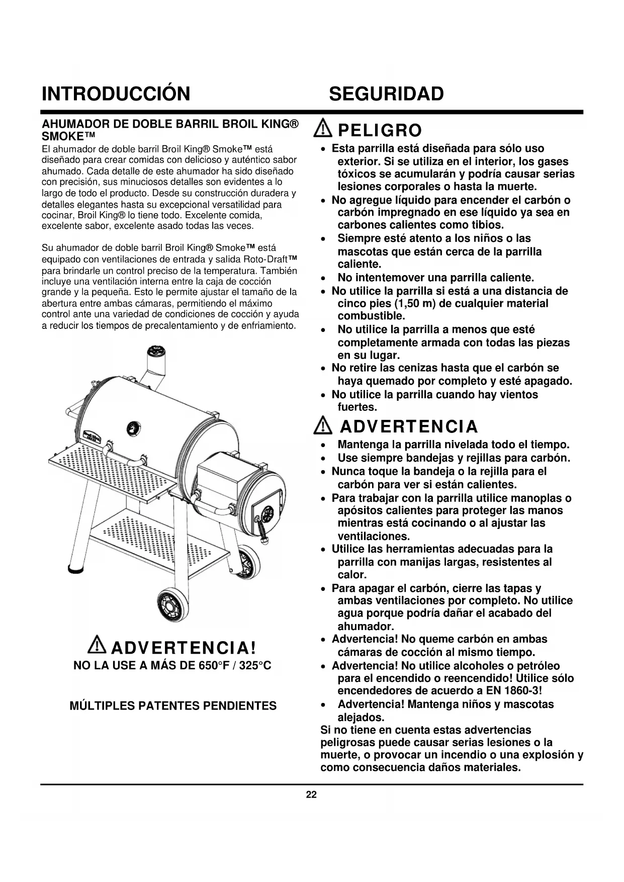 - Advertencia! Mantenga niños y mascotas alejados. Si no tiene en cuenta estas advertencias peligrosas puede causar serias lesiones o la muerte, o provocar un incendio o una explosión y como consecuencia daños materiales.AHUMADOR DE DOBLE BARRIL BROIL KING® SMOKE™