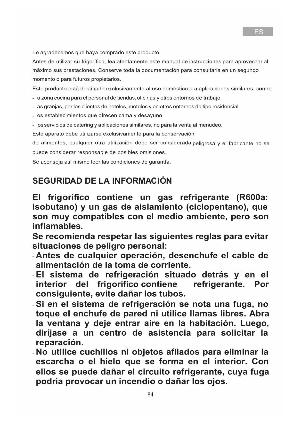 83L e agradecemos que haya comprado este producto. Antes de utilizar su frigorífico, lea atentamente este manual de instrucciones para aprovechar al máximo sus prestaciones. Conserve toda la documentación para consultarla en un segundo momento o para futuros propietarios. Este producto está destinado exclusivamente al uso doméstico o a aplicaciones similares, como: