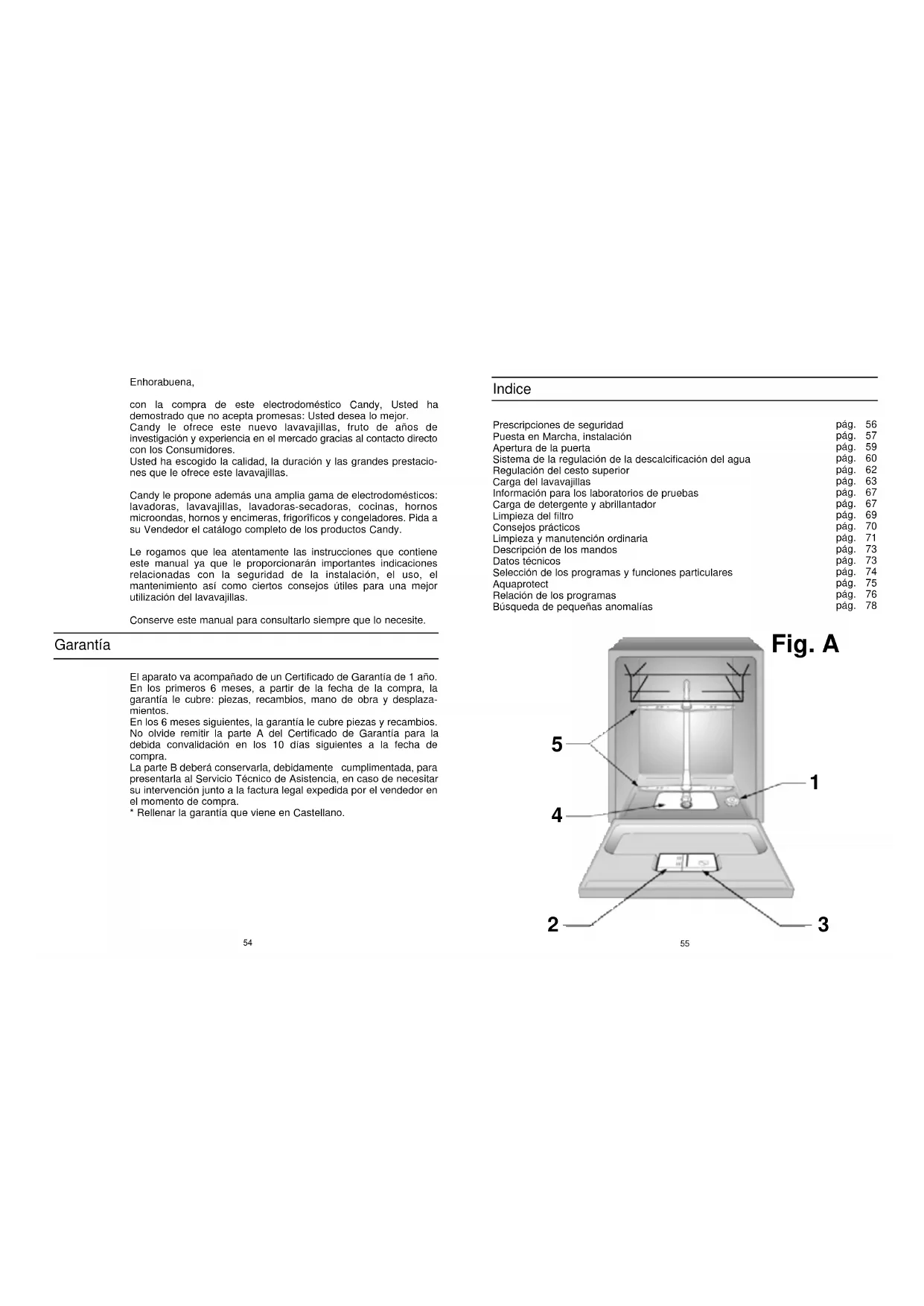 Enhorabuena, con la compra de este electrodoméstico Candy, Usted ha demostrado que no acepta promesas: Usted desea lo mejor. Candy le ofrece este nuevo lavavajillas, fruto de años de investigación y experiencia en el mercado gracias al contacto directo con los Consumidores. Usted ha escogido la calidad, la duración y las grandes prestacio- nes que le ofrece este lavavajillas. Candy le propone además una amplia gama de electrodomésticos: lavadoras, lavavajillas, lavadoras-secadoras, cocinas, hornos microondas, hornos y encimeras, frigorîficos y congeladores. Pida a su Vendedor el catálogo completo de los productos Candy. Le rogamos que lea atentamente las instrucciones que contiene este manual ya que le proporcionarán importantes indicaciones relacionadas con la seguridad de la instalación, el uso, el mantenimiento así como ciertos consejos útiles para una mejor utilización del lavavajillas. Conserve este manual para consultarlo siempre que lo necesite. El aparato va acompañado de un Certificado de Garantía de 1 año. En los primeros 6 meses, a partir de la fecha de la compra, la garantía le cubre: piezas, recambios, mano de obra y desplaza- mientos. En los 6 meses siguientes, la garantía le cubre piezas y recambios. No olvide remitir la parte A del Certificado de Garantía para la debida convalidación en los 10 días siguientes a la fecha de compra. La parte B deberá conservarla, debidamente cumplimentada, para presentarla al Servicio Técnico de Asistencia, en caso de necesitar su intervención junto a la factura legal expedida por el vendedor en el momento de compra.