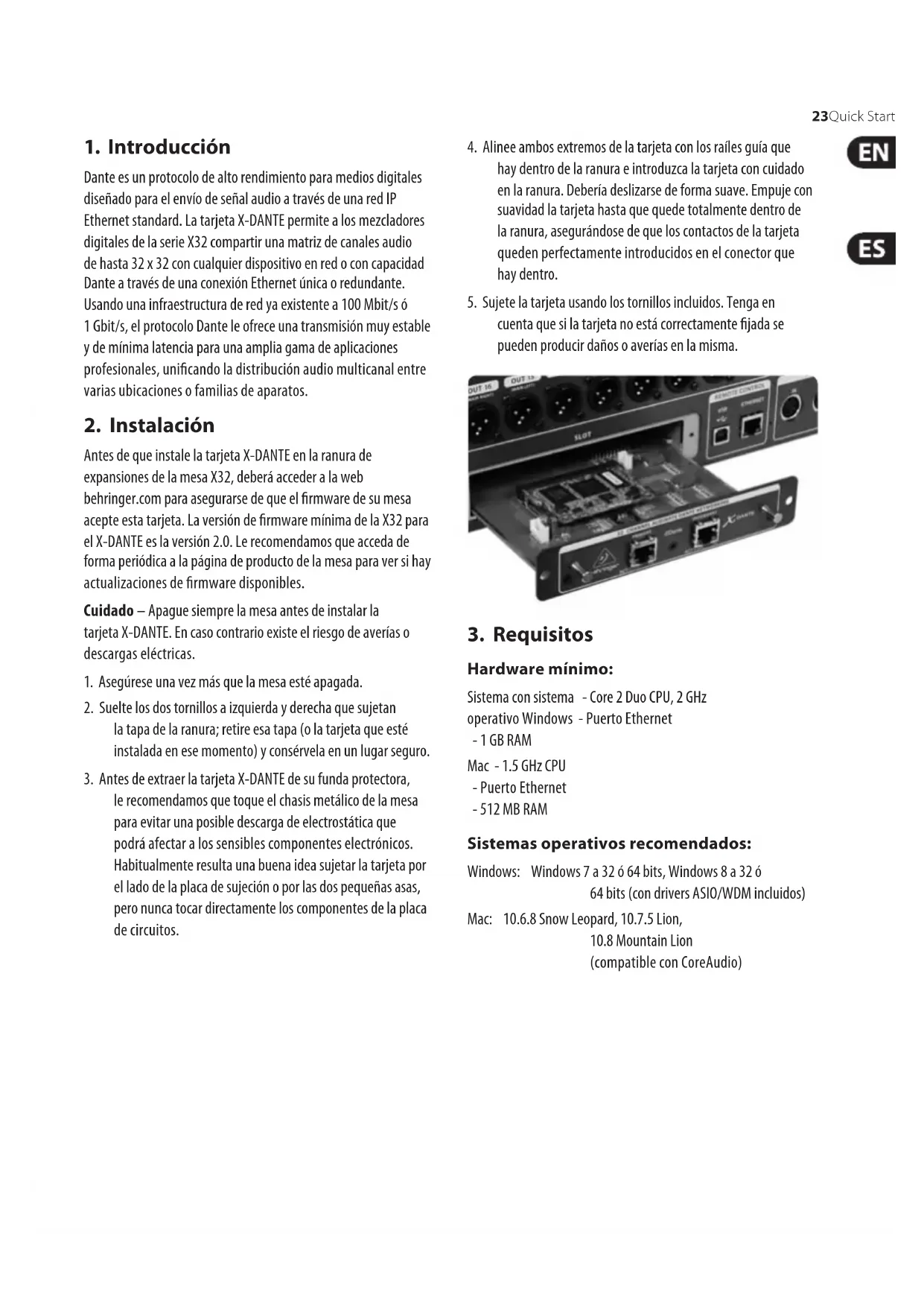 Antes de que instale la tarjeta X-DANTE en la ranura de expansiones de la mesa X32, deberá acceder a la web behringer.com para asegurarse de que el rmware de su mesa acepte esta tarjeta. La versión de rmware mínima de la X32 para el X-DANTE es la versión 2.0. Le recomendamos que acceda de forma periódica a la página de producto de la mesa para ver si hay actualizaciones de rmware disponibles. Cuidado – Apague siempre la mesa antes de instalar la tarjeta X-DANTE. En caso contrario existe el riesgo de averías o descargaseléctricas.