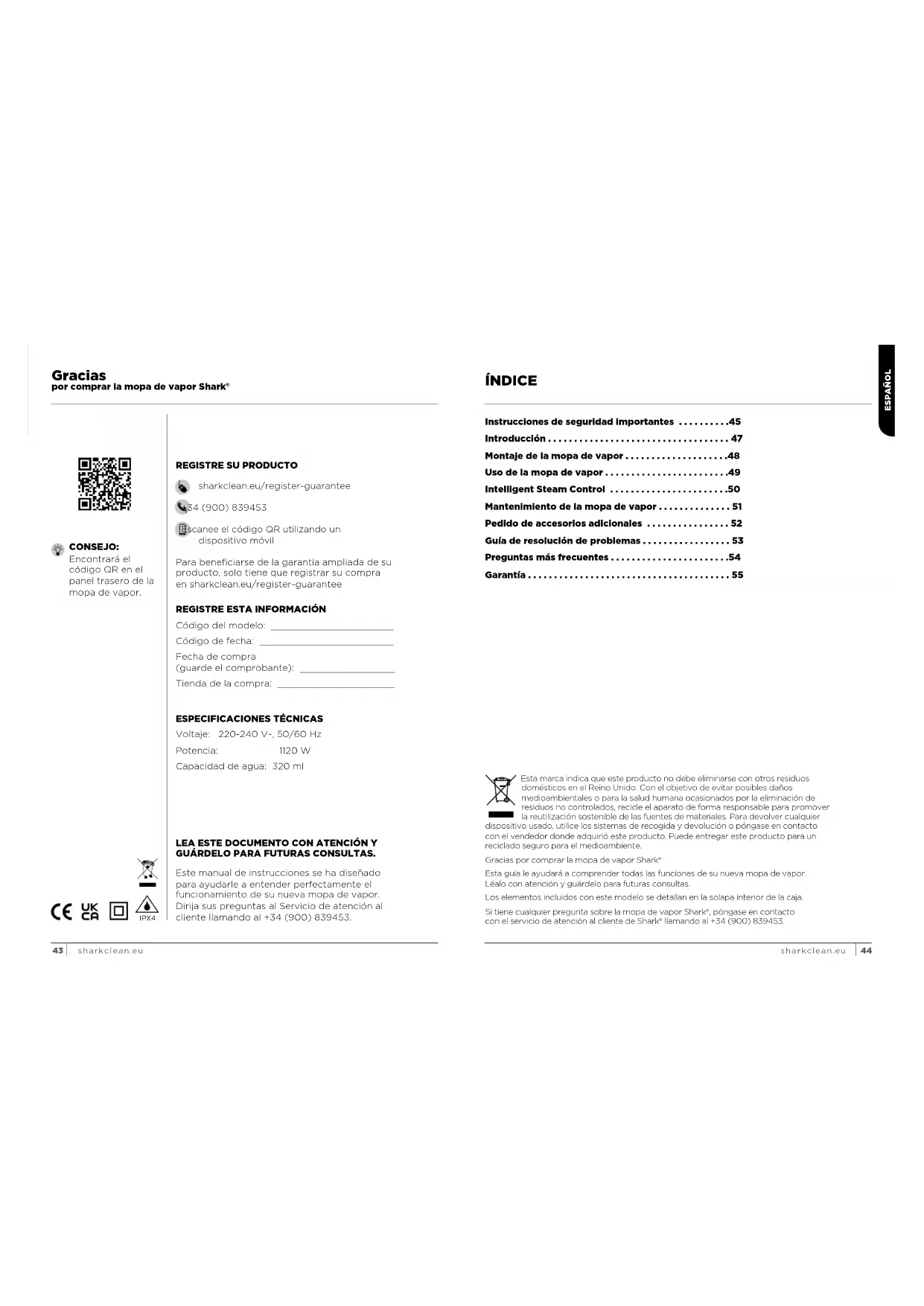 Este manual de instrucciones se ha diseñado para ayudarle a entender perfectamente el funcionamiento de su nueva mopa de vapor. Dirija sus preguntas al Servicio de atención al cliente llamando al +34 (900) 839453. Para beneficiarse de la garantía ampliada de su producto, solo tiene que registrar su compra en sharkclean.eu/register-guarantee