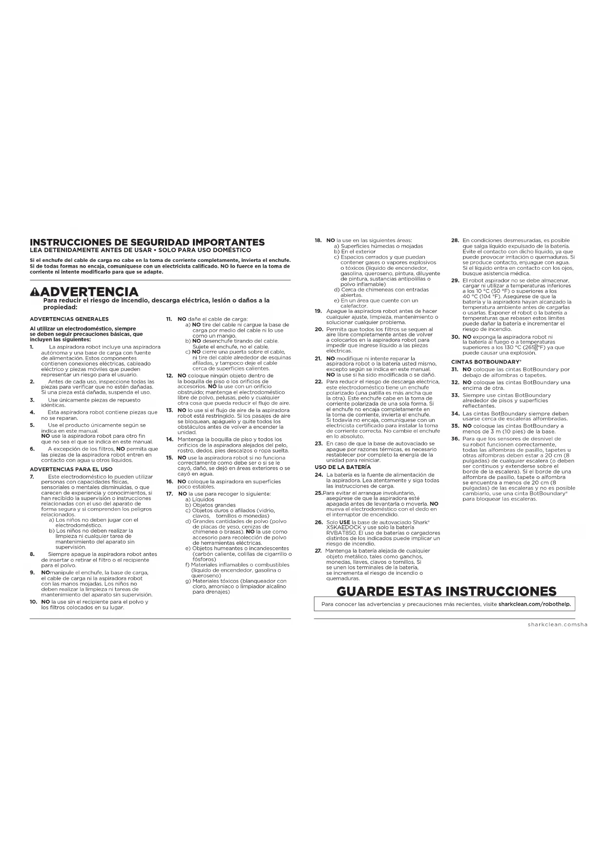 Si el enchufe del cable de carga no cabe en la toma de corriente completamente, invierta el enchufe. Si de todas formas no encaja, comuníquese con un electricista calificado. NO lo fuerce en la toma de corriente ni intente modificarlo para que se adapte. Para conocer las advertencias y precauciones más recientes, visite sharkclean.com/robothelp. ADVERTENCIAS GENERALES Al utilizar un electrodoméstico, siempre se deben seguir precauciones básicas, que incluyen las siguientes: