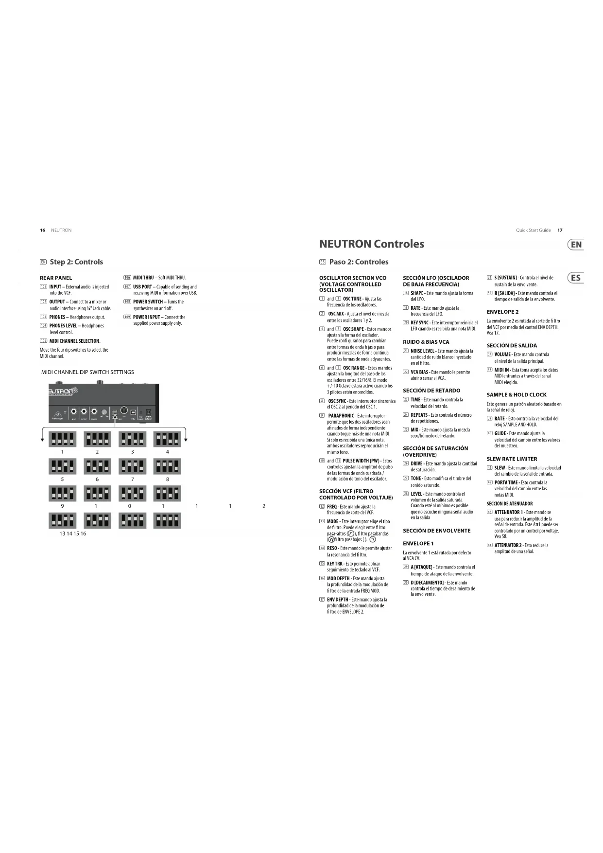(ES) Paso 2: Controles OSCILLATOR SECTION VCO (VOLTAGE CONTROLLED OSCILLATOR) (1) and (3) OSC TUNE - Ajusta las frecuencia de los osciladores.(2) OSC MIX - Ajusta el nivel de mezcla entre los osciladores 1 y 2. (4) and (5) OSC SHAPE - Estos mandos ajustan la forma del oscilador. Puede con gurarlos para cambiar entre formas de onda jas o para producir mezclas de forma continua entre las formas de onda adyacentes. (6) and (7) OSC RANGE - Estos mandos ajustan la longitud del paso de los osciladores entre 32/16/8. El modo +/-10 Octave estará activo cuando los 3 pilotos estén encendidos.(8) OSC SYNC - Este interruptor sincroniza el OSC 2 al periodo del OSC 1.(9) PARAPHONIC - Este interruptor permite que los dos osciladores sean a nados de forma independiente cuando toque más de una nota MIDI. Si solo es recibida una única nota, ambos osciladores reproducirán el mismo tono. (10) and (11) PULSE WIDTH (PW)- Estos controles ajustan la amplitud de pulso de las formas de onda cuadrada / modulación de tono del oscilador.SECCIÓN VCF (FILTRO CONTROLADO POR VOLTAJE)(12) FREQ - Este mando ajusta la frecuencia de corte del VCF.(13) MODE - Este interruptor elige el tipo de ltro. Puede elegir entre ltro pasa-altos (), ltro pasabandas ( ) y ltro pasabajos ( ).(14) RESO - Este mando le permite ajustar la resonancia del ltro.(15) KEY TRK - Esto permite aplicar seguimiento de teclado al VCF.(16) MOD DEPTH - Este mando ajusta la profundidad de la modulación de ltro de la entrada FREQ MOD. (17) ENV DEPTH - Este mando ajusta la profundidad de la modulación de ltro de ENVELOPE 2.SECCIÓN LFO (OSCILADOR DE BAJA FRECUENCIA)(18) SHAPE - Este mando ajusta la forma del LFO.(19) RATE - Este mando ajusta la frecuencia del LFO.(20) KEY SYNC - Este interruptor reinicia el LFO cuando es recibida una nota MIDI.RUIDO & BIAS VCA (21) NOISE LEVEL - Este mando ajusta la cantidad de ruido blanco inyectado en el ltro.(22) VCA BIAS - Este mando le permite abrir o cerrar el VCA.SECCIÓN DE RETARDO(23) TIME - Este mando controla la velocidad del retardo.(24) REPEATS - Esto controla el número de repeticiones.(25) MIX - Este mando ajusta la mezcla seco/húmedo del retardo.SECCIÓN DE SATURACIÓN (OVERDRIVE)(26) DRIVE - Este mando ajusta la cantidad de saturación.(27) TONE - Esto modi ca el timbre del sonido saturado. (28) LEVEL - Este mando controla el volumen de la salida saturada. Cuando esté al mínimo es posible que no escuche ninguna señal audio en la salida SECCIÓN DE ENVOLVENTEENVELOPE 1La envolvente 1 está rutada por defecto al VCA CV.(29) A [ATAQUE] - Este mando controla el tiempo de ataque de la envolvente.(30) D [DECAIMIENTO] - Este mando controla el tiempo de decaimiento de la envolvente.(31) S [SUSTAIN] - Controla el nivel de sustain de la envolvente.(32) R [SALIDA] - Este mando controla el tiempo de salida de la envolvente.ENVELOPE 2La envolvente 2 es rutada al corte de ltro del VCF por medio del control ENV DEPTH. Vea 17.SECCIÓN DE SALIDA(37) VOLUME - Este mando controla el nivel de la salida principal. (38) MIDI IN - Esta toma acepta los datos MIDI entrantes a través del canal MIDI elegido.SAMPLE & HOLD CLOCKEsto genera un patrón aleatorio basado en la señal de reloj.(39) RATE - Esto controla la velocidad del reloj SAMPLE AND HOLD.(40) GLIDE - Este mando ajusta la velocidad del cambio entre los valores del muestreo.SLEW RATE LIMITER(41) SLEW - Este mando limita la velocidad del cambio de la señal de entrada.(42) PORTA TIME - Esto controla la velocidad del cambio entre las notas MIDI. SECCIÓN DE ATENUADOR(43) ATTENUATOR 1 - Este mando se usa para reducir la amplitud de la señal de entrada. Este Att1 puede ser controlado por un control por voltaje. Vea 58.(44) ATTENUATOR 2 - Esto reduce la amplitud de una señal. NEUTRON Controles (EN) Step 2: Controls 16 17Quick Start GuideNEUTRONSECCIÓN DE PATCHBAY DE ENTRADA (45) OSC 1 – CV (control por voltaje) de tono de OSC 1. (46) OSC 2 – CV de tono de OSC 2. (47) OSC1+2 – CV de tono de OSC 1 y 2. (48) INVERT IN – La señal de entrada es invertida en INVERT OUT. Vea 88. (49) SHAPE 1 – CV de forma de OSC 1. (50) SHAPE 2 – CV de forma de OSC 2. (51) PW1 – CV de amplitud de pulso (PW) de OSC 1. (52) PW2 – CV de PW de OSC 2. (53) VCF – Entrada de señal VCF. (54) FREQ MOD – CV de frecuencia de corte VCF. (55) RES – CV de resonancia de VCF. (56) OD IN – Entrada de señal saturada (Overdrive). (57) VCA IN – Entrada de señal VCA. (58) VCA CV – CV de VCA. (59) DELAY IN – Entrada de señal de retardo. (60) DELAY TIME – CV de tiempo de retardo. (61) E.GATE1 – Puerta de la envolvente 1. (62) E.GATE2 – Puerta de la envolvente 2. (63) S&H IN – Entrada de señal Sample and Hold. (64) S&H CLOCK – Entrada de reloj Sample and Hold. (65) LFO RATE – CV de velocidad LFO. (66) LFO SHAPE – CV de forma LFO. (67) LFO TRIG – Entrada de disparo LFO. (68) MULT – Entrada de señal MULT. Vea 92/93. (69) ATT1 IN – Entrada de señal del atenuador 1. (70) ATT1 CV – CV del atenuador 1. (71) ATT2 IN – Entrada de señal del atenuador 2. (72) SLEW IN – Entrada de señal Slew. (73) SUM1(A) – Primera entrada de señal SUM 1. Vea 98. (74) SUM1(B) – Segunda entrada de señal SUM1. Vea 98. (75) SUM2(A) – Primera entrada de señal SUM 2. Vea 99. (76) SUM2(B) – Segunda entrada de señal SUM 2. Vea 99.