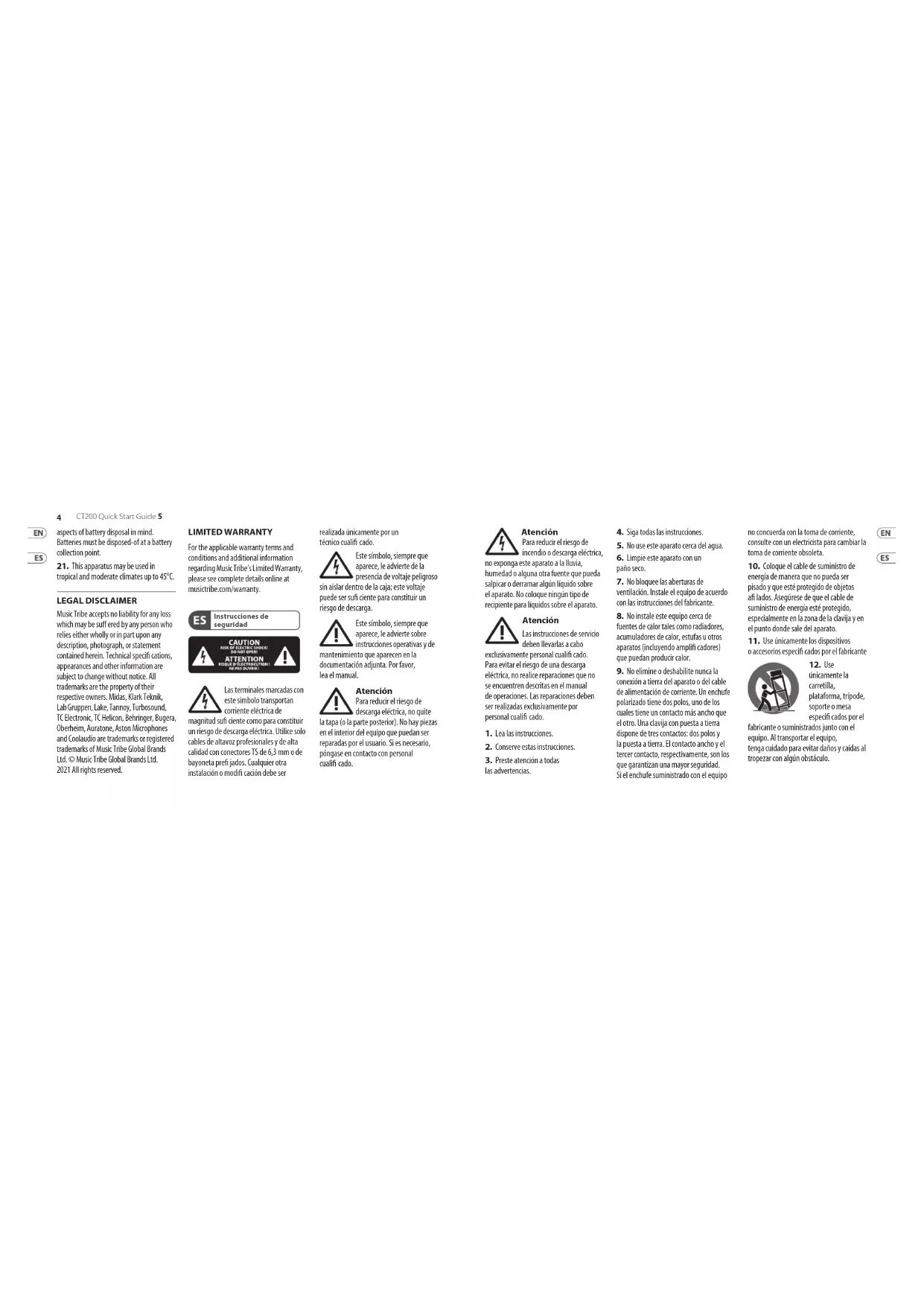 tropical and moderate climates up to 45°C. LEGAL DISCLAIMER Music Tribe accepts no liability for any loss which may be su ered by any person who relies either wholly or in part upon any description, photograph, or statement contained herein. Technical speci cations, appearances and other information are subject to change without notice. All trademarks are the property of their respective owners. Midas, Klark Teknik, Lab Gruppen, Lake, Tannoy, Turbosound, TC Electronic, TC Helicon, Behringer, Bugera, Oberheim, Auratone, Aston Microphones and Coolaudio are trademarks or registered trademarks of Music Tribe Global Brands Ltd. © Music Tribe Global Brands Ltd. 2021 All rights reserved. LIMITED WARRANTY For the applicable warranty terms and conditions and additional information regarding Music Tribe’s Limited Warranty, please see complete details online at musictribe.com/warranty. Las terminales marcadas con este símbolo transportan corriente eléctrica de magnitud su ciente como para constituir un riesgo de descarga eléctrica. Utilicesolo cables de altavoz profesionales y de alta calidad con conectores TS de 6,3 mm o de bayoneta pre jados. Cualquier otra instalación o modi cación debe ser realizada únicamente por un técnicocuali cado. Este símbolo, siempre que aparece, leadvierte de la presencia de voltaje peligroso sin aislar dentro de la caja; estevoltaje puede ser su ciente para constituir un riesgo dedescarga. Este símbolo, siempre que aparece, leadvierte sobre instrucciones operativas y de mantenimiento que aparecen en la documentación adjunta. Por favor, leaelmanual. Atención Para reducir el riesgo de descarga eléctrica, no quite la tapa (olaparte posterior). Nohay piezas en el interior del equipo que puedan ser reparadas por el usuario. Sies necesario, póngase en contacto con personal cuali cado. Instrucciones de seguridad Atención Para reducir el riesgo de incendio o descarga eléctrica, no exponga este aparato a la lluvia, humedad o alguna otra fuente que pueda salpicar o derramar algún líquido sobre el aparato. Nocoloque ningún tipo de recipiente para líquidos sobre elaparato. Atención Las instrucciones de servicio deben llevarlas a cabo exclusivamente personal cuali cado. Paraevitar el riesgo de una descarga eléctrica, no realice reparaciones que no se encuentren descritas en el manual de operaciones. Lasreparaciones deben ser realizadas exclusivamente por personalcuali cado.