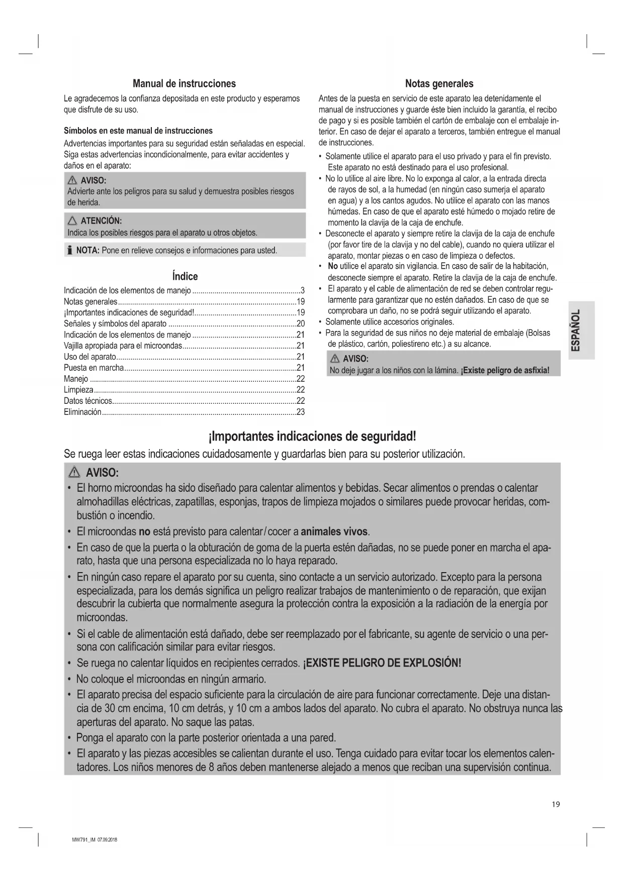 - Este aparato se usa para calentar y cocer alimentos sólidos o líquidos. Está diseñado para ser usado en domicilios y aplicaciones similares, como: - cocinas para personal en tiendas, ocinas y otros entornos industriales; - clientes de hoteles, moteles y otras instalaciones residenciales; - en instalaciones agrícolas; - en pensiones. Señales y símbolos del aparato Hay un símbolo de advertencia acoplado a la supercie superior del horno microondas: AVISO: ¡Supercie caliente! ¡Peligro de quemaduras! La temperatura de las supercies accesibles puede ser muy alta durante y después del funcionamiento.21 MW791_IM 07.09.2018 Tenga también en cuenta las indicaciones informativas del microondas: Traducción: WARNING Aviso